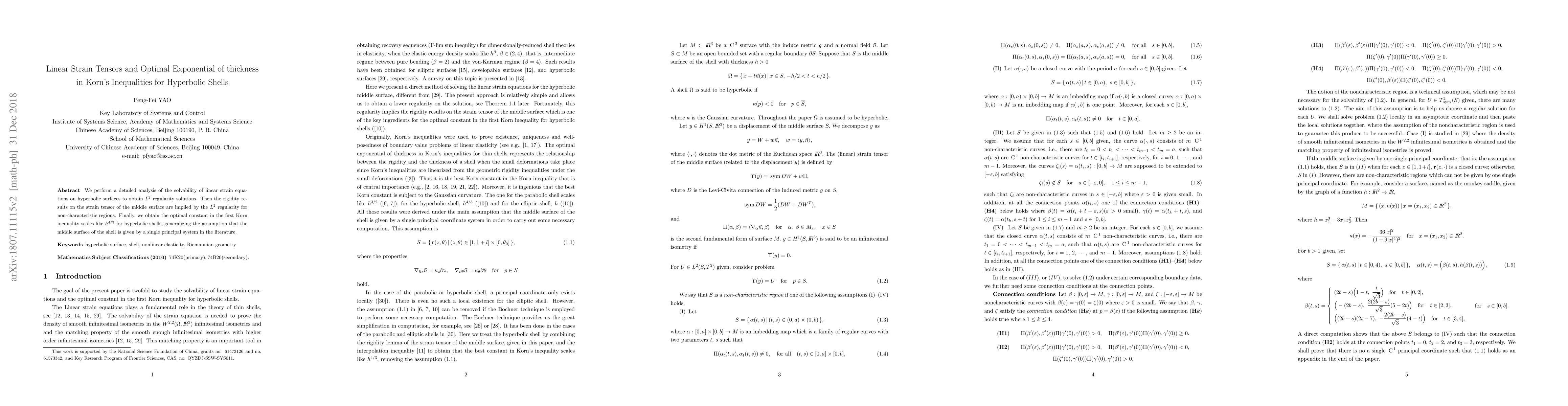 This paper analyzes the solvability of linear strain equations on hyperbolic surfaces to achieve $L^2$ regularity solutions, establishing rigidity results for the strain tensor. It generalizes the optimal constant in the first Korn inequality to $h^{4/3}$ for hyperbolic shells, moving beyond the traditional single principal system assumption.