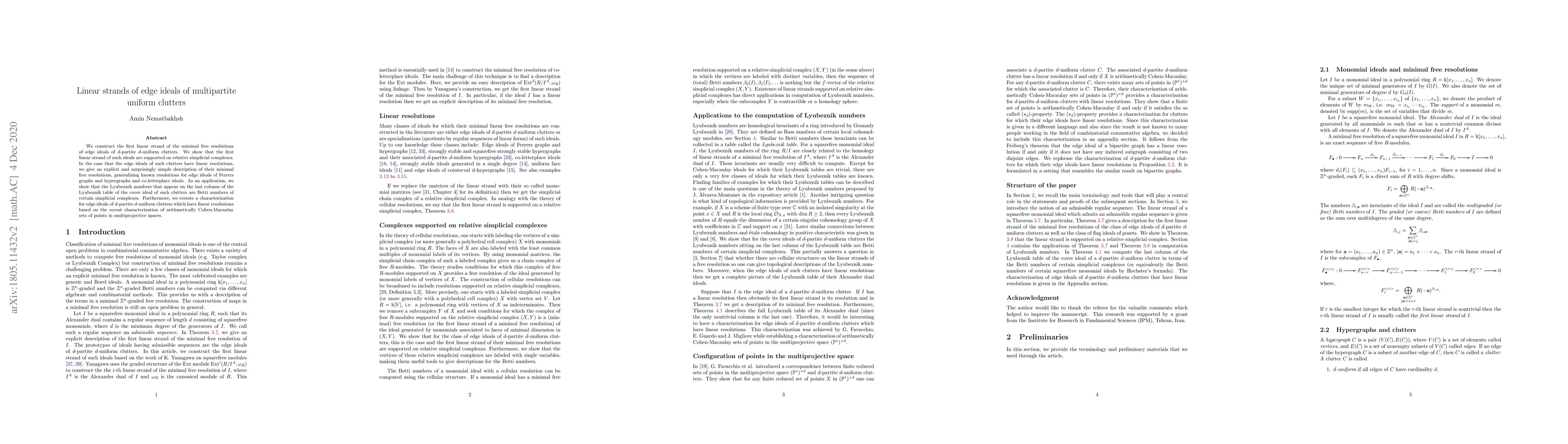 This paper constructs the first linear strand of the minimal free resolution for edge ideals of $d$-partite $d$-uniform clutters, showing it is supported on a relative simplicial complex. It provides a simple description for linear resolutions of such edge ideals, extending previous resolutions for Ferrers graphs and hypergraphs, and relates these to Lyubeznik numbers and simplicial complexes.