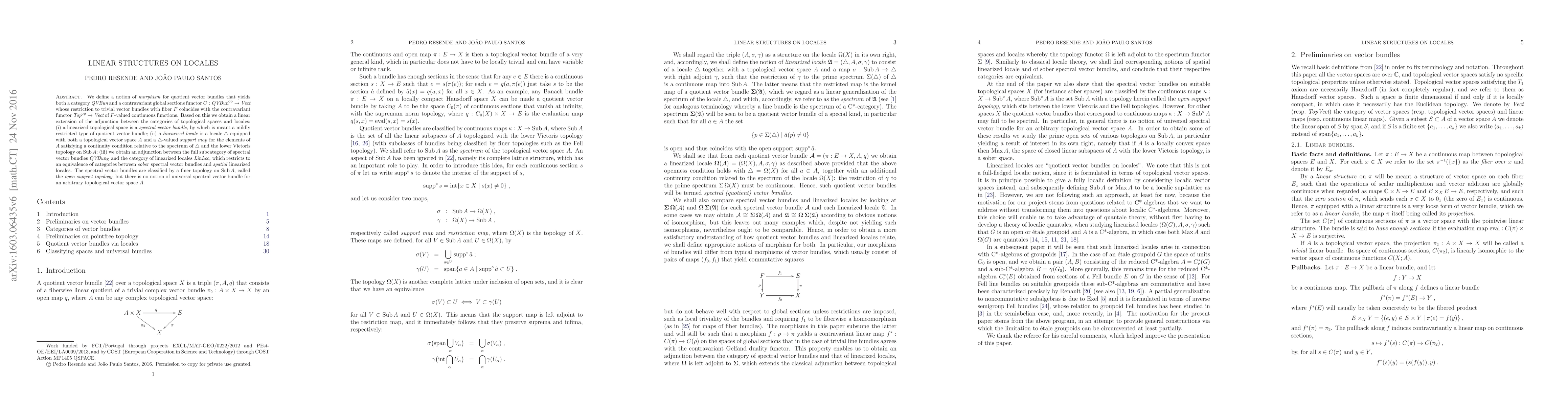 We define a notion of morphism for quotient vector bundles that yields both a category $\textit{QVBun}$ and a contravariant global sections functor $C:\textit{QVBun}^{\textrm{op}}\to\textit{Vect}$ whose restriction to trivial vector bundles with fiber $F$ coincides with the contravariant functor $\textit{Top}^{\textrm{op}}\to\textit{Vect}$ of $F$-valued continuous functions. Based on this we obtain a linear extension of the adjunction between the categories of topological spaces and locales: (i) a linearized topological space is a spectral vector bundle, by which is meant a mildly restricted type of quotient vector bundle; (ii) a linearized locale is a locale $\triangle$ equipped with both a topological vector space $A$ and a $\triangle$-valued support map for the elements of $A$ satisfying a continuity condition relative to the spectrum of $\triangle$ and the lower Vietoris topology on $\operatorname{Sub} A$; (iii) we obtain an adjunction between the full subcategory of spectral vector bundles $\textit{QVBun}_{\Sigma}$ and the category of linearized locales $\textit{LinLoc}$, which restricts to an equivalence of categories between sober spectral vector bundles and spatial linearized locales. The spectral vector bundles are classified by a finer topology on $\operatorname{Sub} A$, called the open support topology, but there is no notion of universal spectral vector bundle for an arbitrary topological vector space $A$.