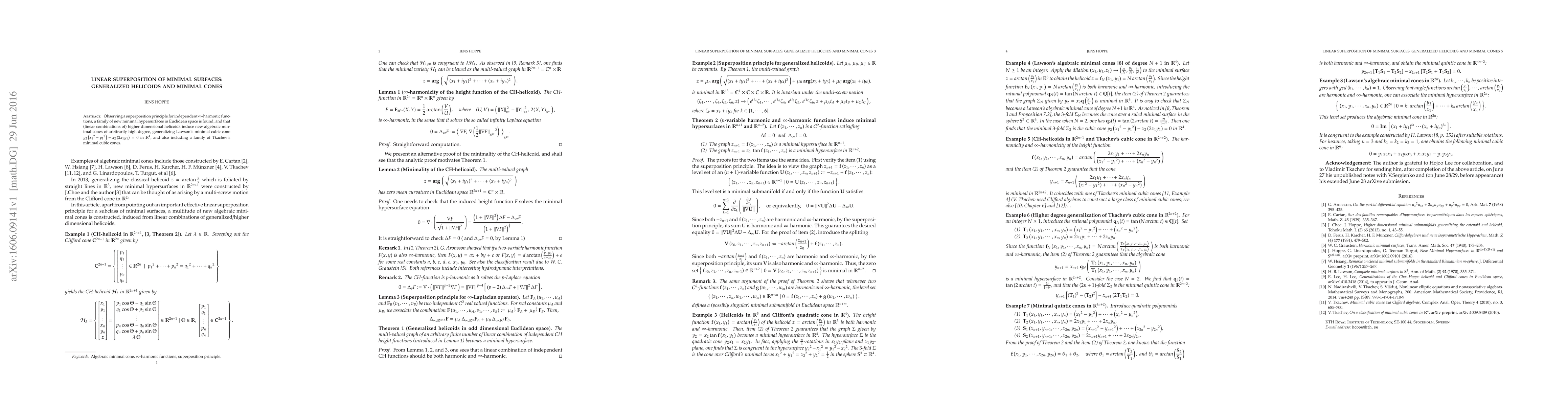 Summary: This paper discovers a linear superposition principle leading to new minimal hypersurfaces in Euclidean space, including algebraic minimal cones of any degree derived from generalized helicoids.