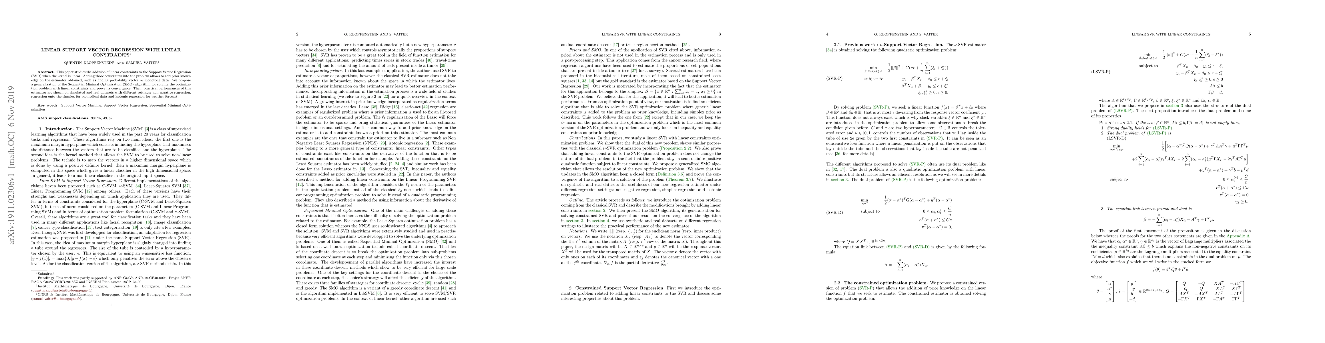 This paper studies the addition of linear constraints to the Support Vector Regression (SVR) when the kernel is linear. Adding those constraints into the problem allows to add prior knowledge on the estimator obtained, such as finding probability vector or monotone data. We propose a generalization of the Sequential Minimal Optimization (SMO) algorithm for solving the optimization problem with linear constraints and prove its convergence. Then, practical performances of this estimator are shown on simulated and real datasets with different settings: non negative regression, regression onto the simplex for biomedical data and isotonic regression for weather forecast.
