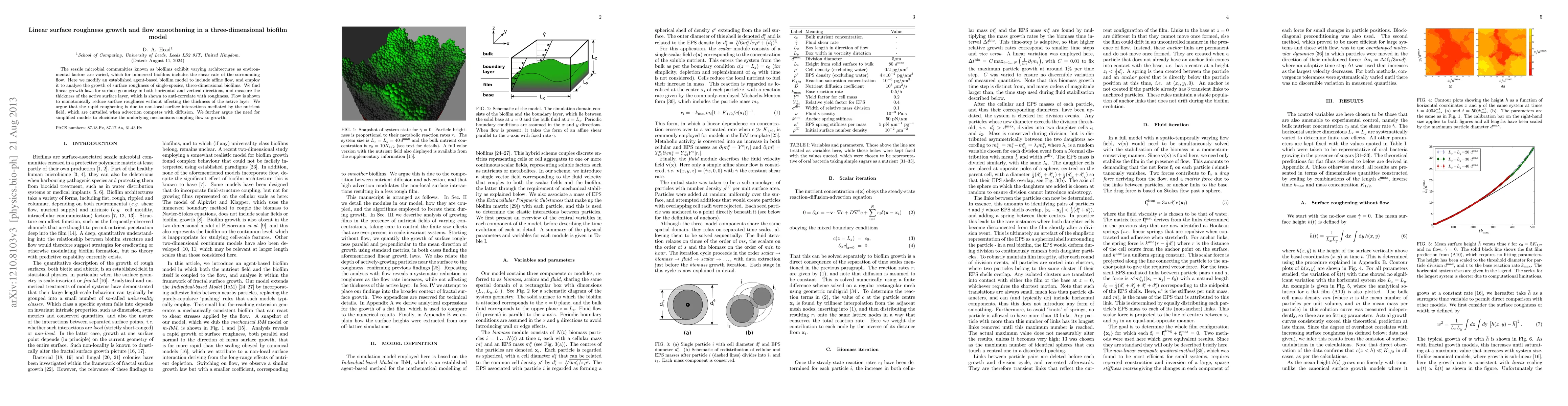 This paper modifies an agent-based biofilm model to study the growth of surface roughness in three-dimensional biofilms under varying shear rates, finding linear growth laws for surface geometry and demonstrating that flow smoothens the surface without altering the active layer's thickness. The authors suggest that flow reduces roughness by curtailing non-local interactions, emphasizing the need for simplified models to understand these mechanisms.