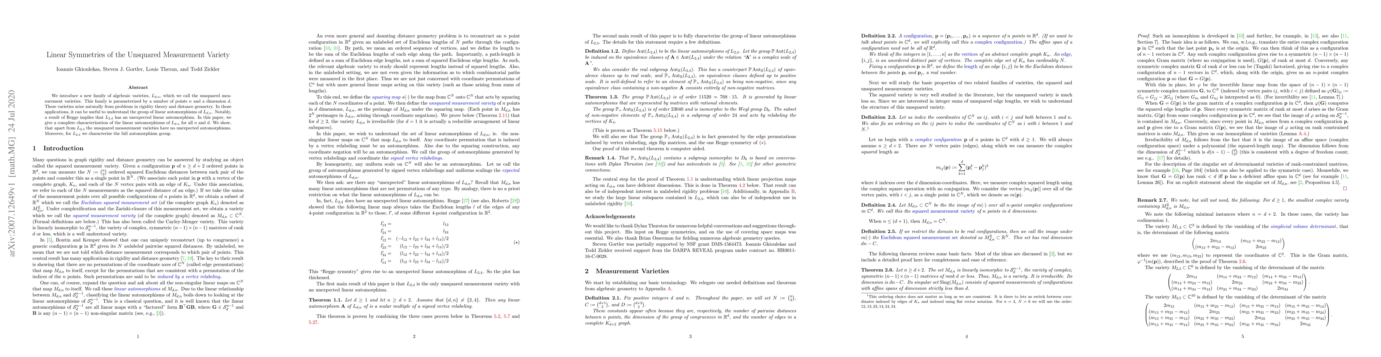 We introduce a new family of algebraic varieties, $L_{d,n}$, which we call the unsquared measurement varieties. This family is parameterized by a number of points $n$ and a dimension $d$. These varieties arise naturally from problems in rigidity theory and distance geometry. In those applications, it can be useful to understand the group of linear automorphisms of $L_{d,n}$. Notably, a result of Regge implies that $L_{2,4}$ has an unexpected linear automorphism. In this paper, we give a complete characterization of the linear automorphisms of $L_{d,n}$ for all $n$ and $d$. We show, that apart from $L_{2,4}$ the unsquared measurement varieties have no unexpected automorphisms. Moreover, for $L_{2,4}$ we characterize the full automorphism group.