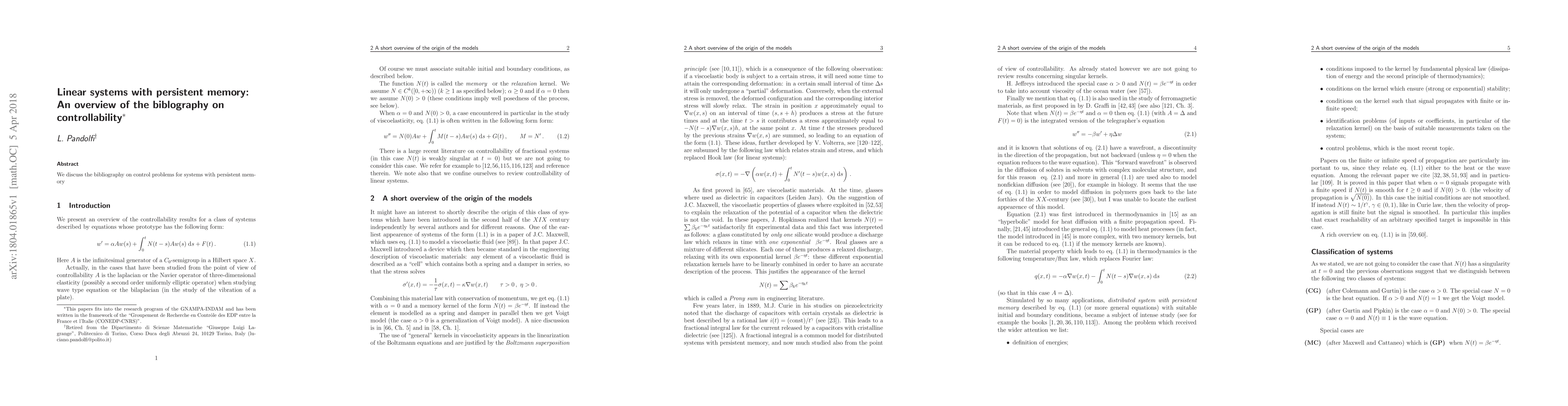 Summary: This paper provides an overview of existing literature on controllability issues in linear systems equipped with persistent memory. It highlights key studies and developments in the field, focusing on the theoretical and practical aspects of controlling such systems.