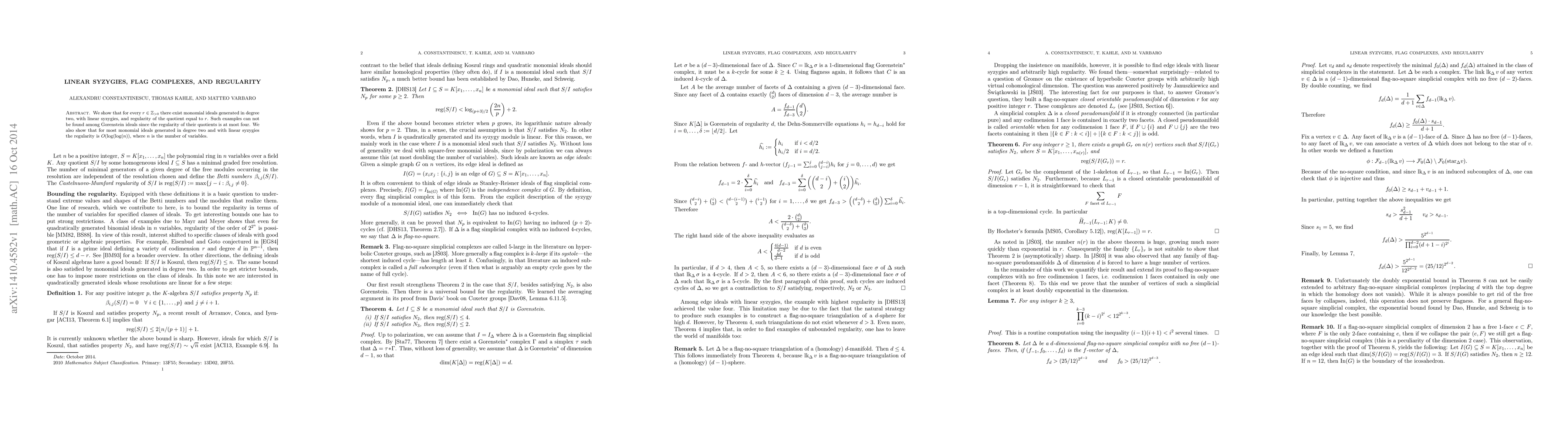 This paper demonstrates the existence of monomial ideals generated in degree two, exhibiting linear syzygies and a specified regularity, contrasting them with Gorenstein ideals. It also proves that for many such ideals, the regularity increases at most doubly logarithmically with the number of variables.