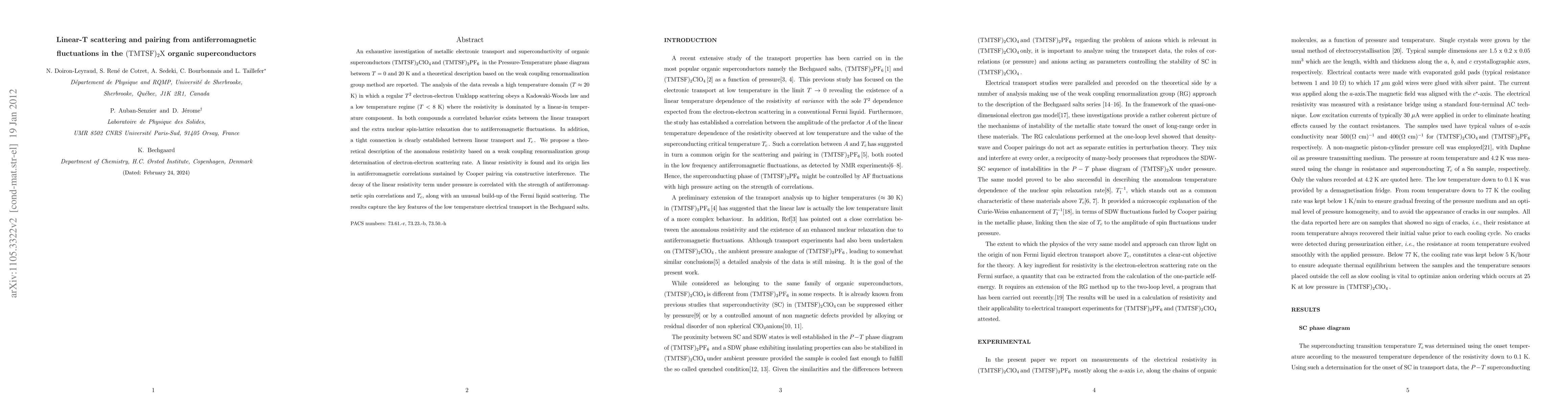 An exhaustive investigation of metallic electronic transport and superconductivity of organic superconductors (TMTSF)_2PF_6 and (TMTSF)_2ClO_4 in the Pressure-Temperature phase diagram between T=0 and 20 K and a theoretical description based on the weak coupling renormalization group method are reported. The analysis of the data reveals a high temperature domain (T\approx 20 K) in which a regular T^2 electron-electron Umklapp scattering obeys a Kadowaki-Woods law and a low temperature regime (T< 8 K) where the resistivity is dominated by a linear-in temperature component. In both compounds a correlated behavior exists between the linear transport and the extra nuclear spin-lattice relaxation due to antiferromagnetic fluctuations. In addition, a tight connection is clearly established between linear transport and T_c. We propose a theoretical description of the anomalous resistivity based on a weak coupling renormalization group determination of electron-electron scattering rate. A linear resistivity is found and its origin lies in antiferromagnetic correlations sustained by Cooper pairing via constructive interference. The decay of the linear resistivity term under pressure is correlated with the strength of antiferromagnetic spin correlations and T_c, along with an unusual build-up of the Fermi liquid scattering. The results capture the key features of the low temperature electrical transport in the Bechgaard salts.
