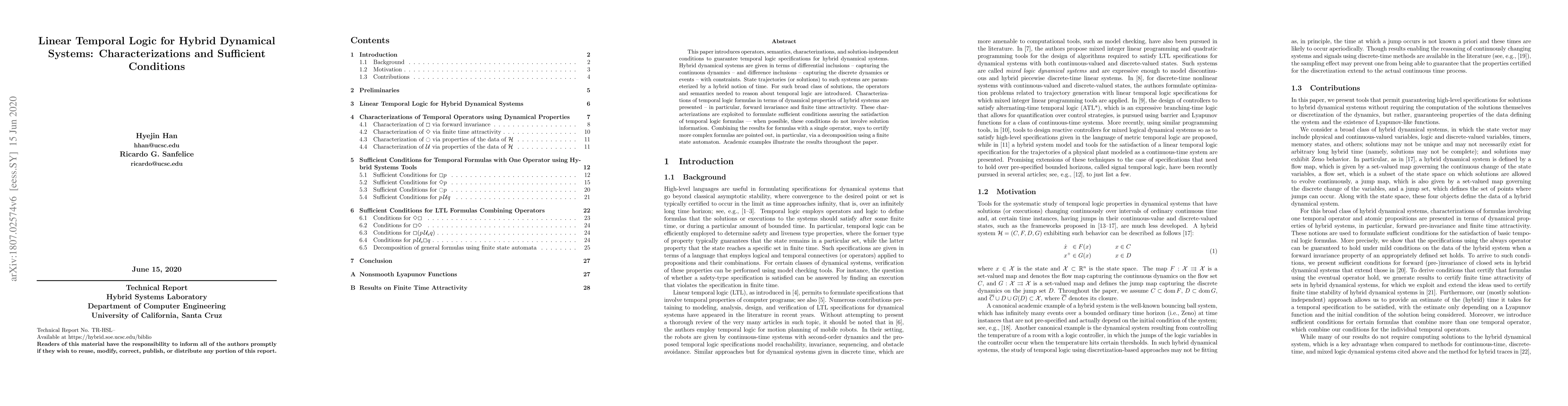 This paper develops operators and semantics for reasoning about temporal logic in hybrid dynamical systems, presenting characterizations and sufficient conditions for satisfying temporal logic specifications without requiring solution information. It also outlines methods for certifying complex temporal logic formulas using finite state automata.