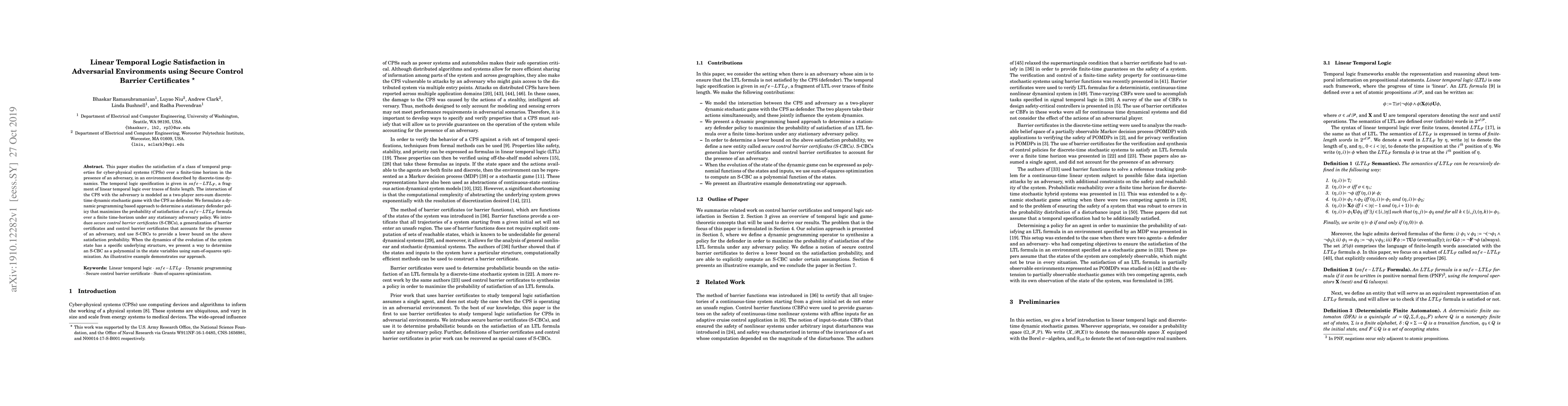 This paper studies the satisfaction of a class of temporal properties for cyber-physical systems (CPSs) over a finite-time horizon in the presence of an adversary, in an environment described by discrete-time dynamics. The temporal logic specification is given in safe-LTL_F, a fragment of linear temporal logic over traces of finite length. The interaction of the CPS with the adversary is modeled as a two-player zero-sum discrete-time dynamic stochastic game with the CPS as defender. We formulate a dynamic programming based approach to determine a stationary defender policy that maximized the probability of satisfaction of a safe-LTL_F formula over a finite time-horizon under any stationary adversary policy. We introduce secure control barrier certificates (S-CBCs), a generalization of barrier certificates and control barrier certificates that accounts for the presence of an adversary, and use S-CBCs to provide a lower bound on the above satisfaction probability. When the dynamics of the evolution of the system state has a specific underlying structure, we present a way to determine an S-CBC as a polynomial in the state variables using sum-of-squares optimization. An illustrative example demonstrates our approach.