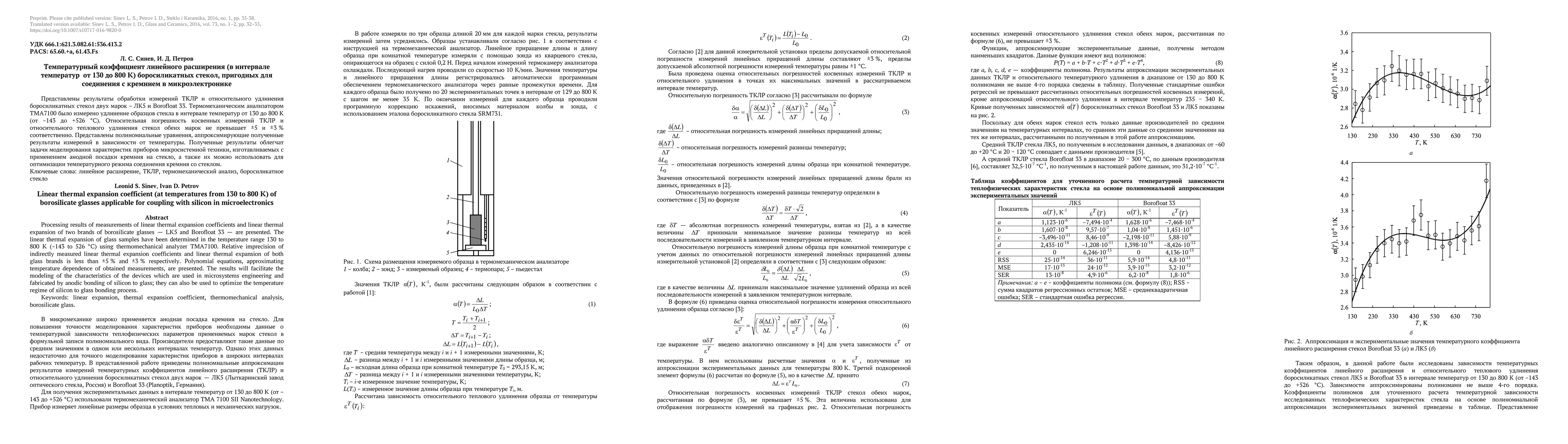 This study measures the linear thermal expansion coefficients of two borosilicate glass brands (LK5 and Borofloat 33) from 130 to 800 K using a thermomechanical analyzer. The results provide polynomial approximations for temperature dependence and will aid in optimizing silicon-to-glass bonding processes in microelectronics.