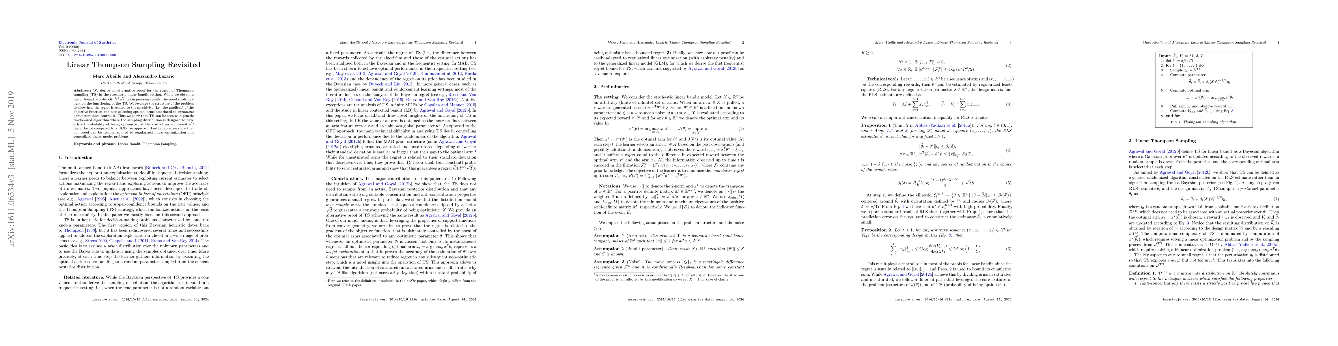 We derive an alternative proof for the regret of Thompson sampling (\ts) in the stochastic linear bandit setting. While we obtain a regret bound of order $\widetilde{O}(d^{3/2}\sqrt{T})$ as in previous results, the proof sheds new light on the functioning of the \ts. We leverage on the structure of the problem to show how the regret is related to the sensitivity (i.e., the gradient) of the objective function and how selecting optimal arms associated to \textit{optimistic} parameters does control it. Thus we show that \ts can be seen as a generic randomized algorithm where the sampling distribution is designed to have a fixed probability of being optimistic, at the cost of an additional $\sqrt{d}$ regret factor compared to a UCB-like approach. Furthermore, we show that our proof can be readily applied to regularized linear optimization and generalized linear model problems.