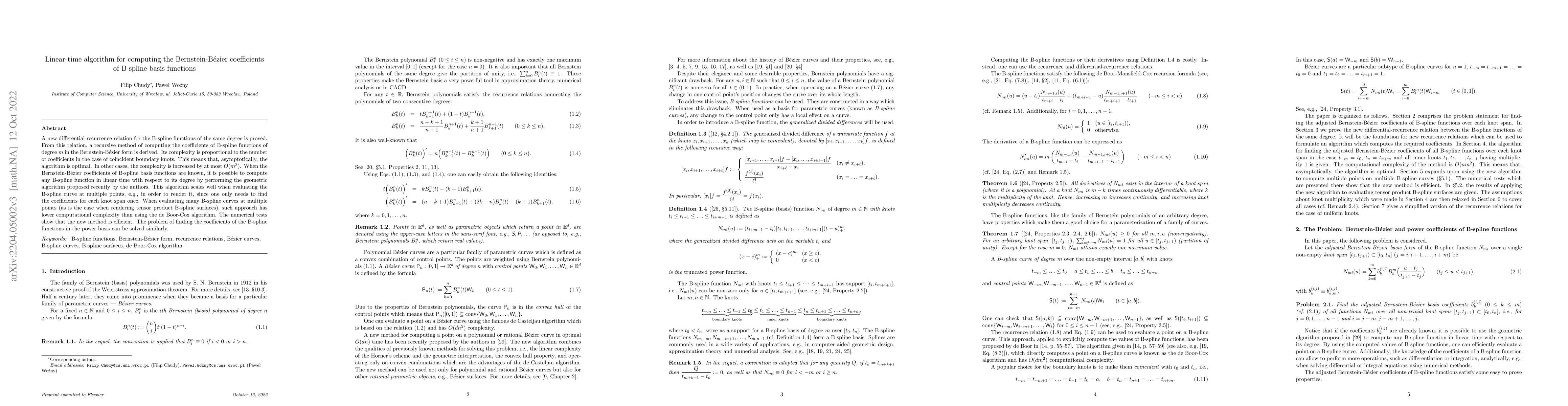 A new differential-recurrence relation for the B-spline functions of the same degree is proved. From this relation, a recursive method of computing the coefficients of B-spline functions of degree $m$ in the Bernstein-B\'{e}zier form is derived. Its complexity is proportional to the number of coefficients in the case of coincident boundary knots. This means that, asymptotically, the algorithm is optimal. In other cases, the complexity is increased by at most $O(m^3)$. When the Bernstein-B\'{e}zier coefficients of B-spline basis functions are known, it is possible to compute any B-spline function in linear time with respect to its degree by performing the geometric algorithm proposed recently by the authors. This algorithm scales well when evaluating the B-spline curve at multiple points, e.g., in order to render it, since one only needs to find the coefficients for each knot span once. When evaluating many B-spline curves at multiple points (as is the case when rendering tensor product B-spline surfaces), such approach has lower computational complexity than using the de Boor-Cox algorithm. The numerical tests show that the new method is efficient. The problem of finding the coefficients of the B-spline functions in the power basis can be solved similarly.