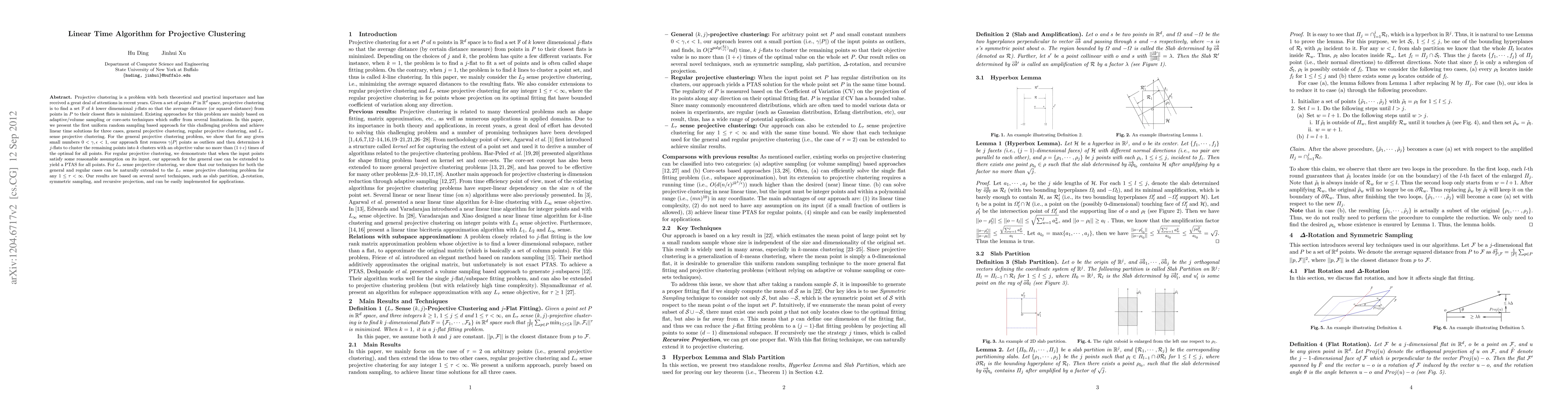 This paper introduces a linear time algorithm for projective clustering based on uniform random sampling, achieving solutions for general, regular, and $L_{\tau}$ sense projective clustering. The approach effectively removes outliers and determines $j$-flats to cluster points, offering a PTAS under certain assumptions and extending to various $L_{\tau}$ norms.