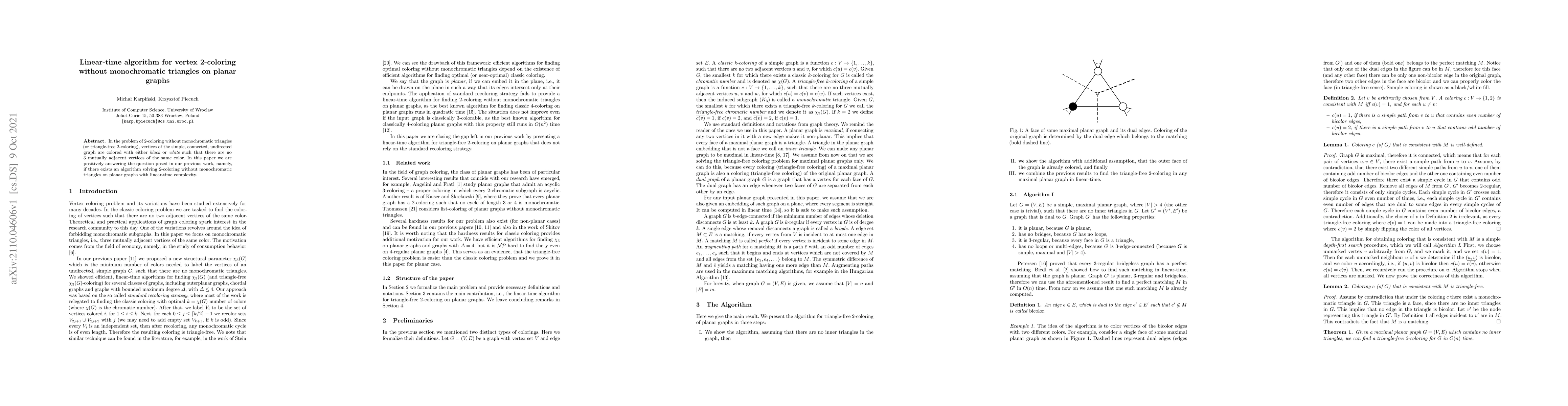 This paper presents a linear-time algorithm for 2-coloring planar graphs such that no monochromatic triangles are formed. The authors confirm the existence of an efficient solution to the problem of triangle-tree 2-coloring on planar graphs.