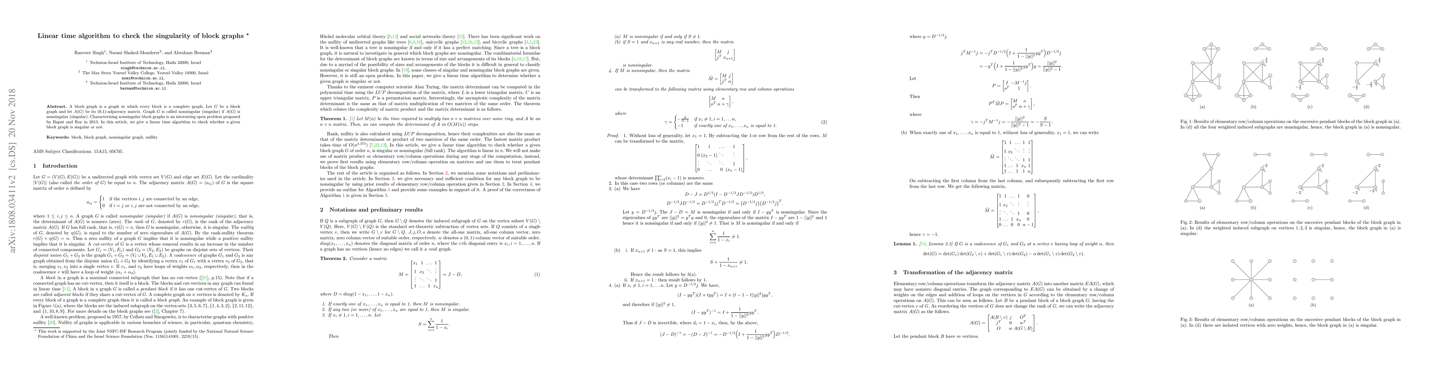 A block graph is a graph in which every block is a complete graph. Let $G$ be a block graph and let $A(G)$ be its (0,1)-adjacency matrix. Graph $G$ is called nonsingular (singular) if $A(G)$ is nonsingular (singular). Characterizing nonsingular block graphs is an interesting open problem proposed by Bapat and Roy in 2013. In this article, we give a linear time algorithm to check whether a given block graph is singular or not.
