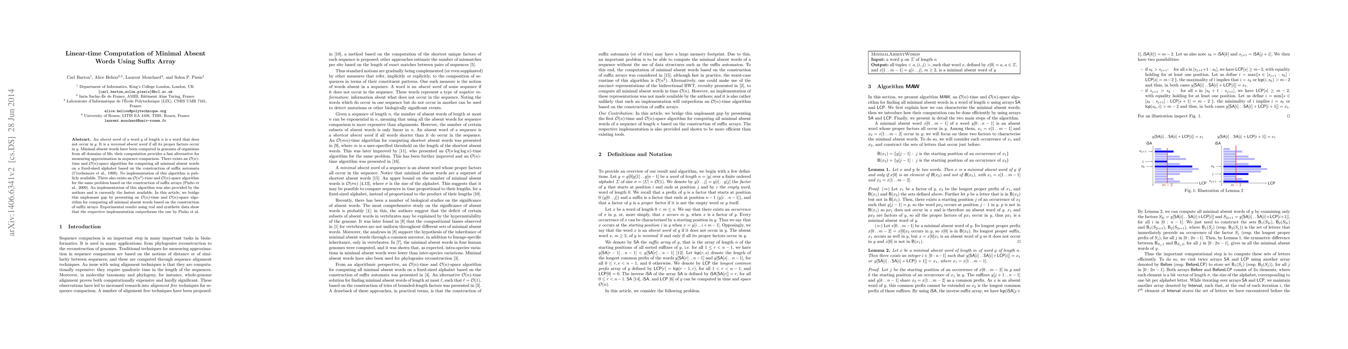 This paper presents an O(n)-time and O(n)-space algorithm for computing minimal absent words using suffix arrays, bridging the gap between existing O(n) and O(n^2) algorithms. Experimental results demonstrate that the new implementation outperforms previous methods.
