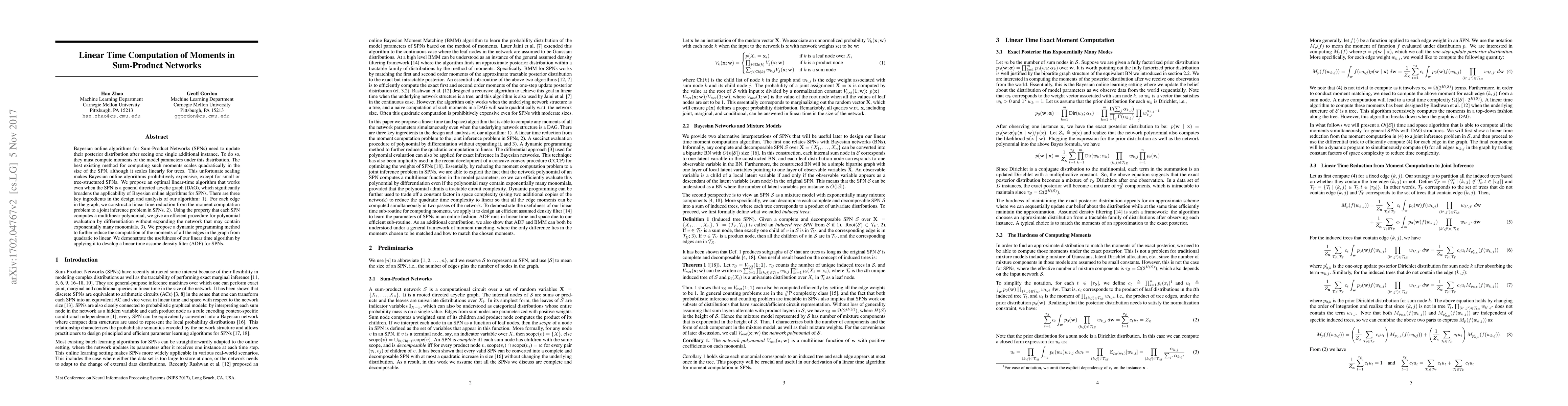 Bayesian online algorithms for Sum-Product Networks (SPNs) need to update their posterior distribution after seeing one single additional instance. To do so, they must compute moments of the model parameters under this distribution. The best existing method for computing such moments scales quadratically in the size of the SPN, although it scales linearly for trees. This unfortunate scaling makes Bayesian online algorithms prohibitively expensive, except for small or tree-structured SPNs. We propose an optimal linear-time algorithm that works even when the SPN is a general directed acyclic graph (DAG), which significantly broadens the applicability of Bayesian online algorithms for SPNs. There are three key ingredients in the design and analysis of our algorithm: 1). For each edge in the graph, we construct a linear time reduction from the moment computation problem to a joint inference problem in SPNs. 2). Using the property that each SPN computes a multilinear polynomial, we give an efficient procedure for polynomial evaluation by differentiation without expanding the network that may contain exponentially many monomials. 3). We propose a dynamic programming method to further reduce the computation of the moments of all the edges in the graph from quadratic to linear. We demonstrate the usefulness of our linear time algorithm by applying it to develop a linear time assume density filter (ADF) for SPNs.
