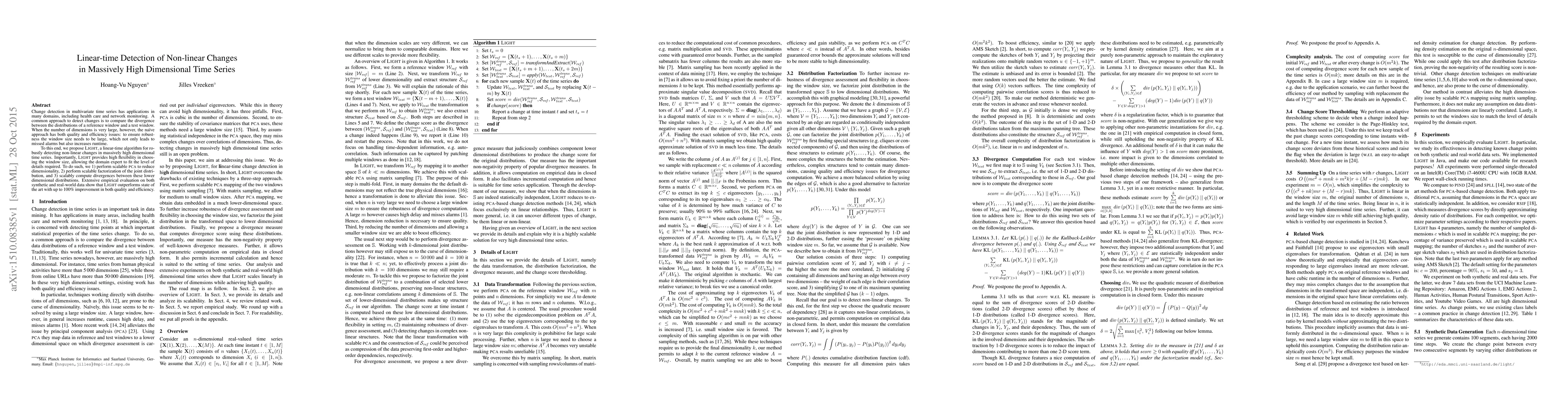 Change detection in multivariate time series has applications in many domains, including health care and network monitoring. A common approach to detect changes is to compare the divergence between the distributions of a reference window and a test window. When the number of dimensions is very large, however, the naive approach has both quality and efficiency issues: to ensure robustness the window size needs to be large, which not only leads to missed alarms but also increases runtime. To this end, we propose LIGHT, a linear-time algorithm for robustly detecting non-linear changes in massively high dimensional time series. Importantly, LIGHT provides high flexibility in choosing the window size, allowing the domain expert to fit the level of details required. To do such, we 1) perform scalable PCA to reduce dimensionality, 2) perform scalable factorization of the joint distribution, and 3) scalably compute divergences between these lower dimensional distributions. Extensive empirical evaluation on both synthetic and real-world data show that LIGHT outperforms state of the art with up to 100% improvement in both quality and efficiency.