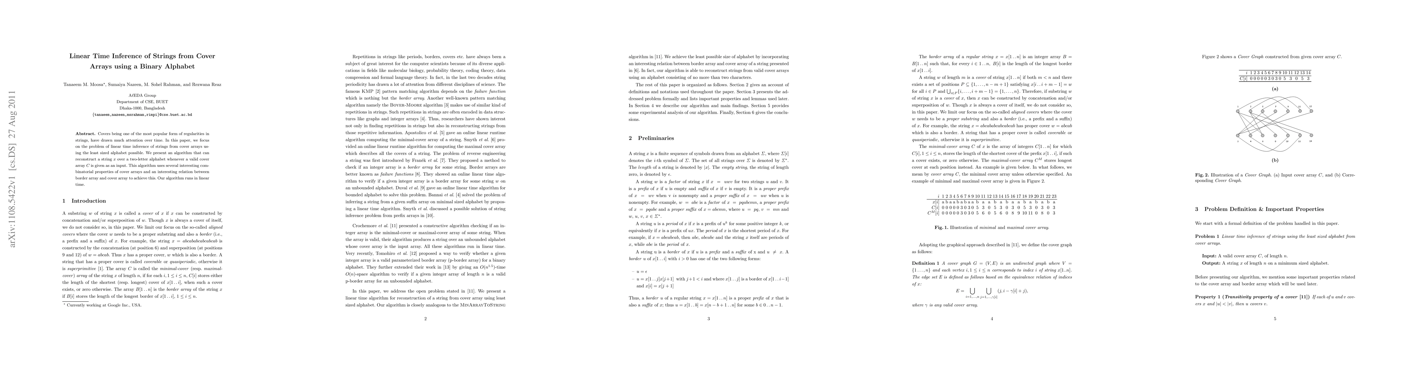 Covers being one of the most popular form of regularities in strings, have drawn much attention over time. In this paper, we focus on the problem of linear time inference of strings from cover arrays using the least sized alphabet possible. We present an algorithm that can reconstruct a string $x$ over a two-letter alphabet whenever a valid cover array $C$ is given as an input. This algorithm uses several interesting combinatorial properties of cover arrays and an interesting relation between border array and cover array to achieve this. Our algorithm runs in linear time.