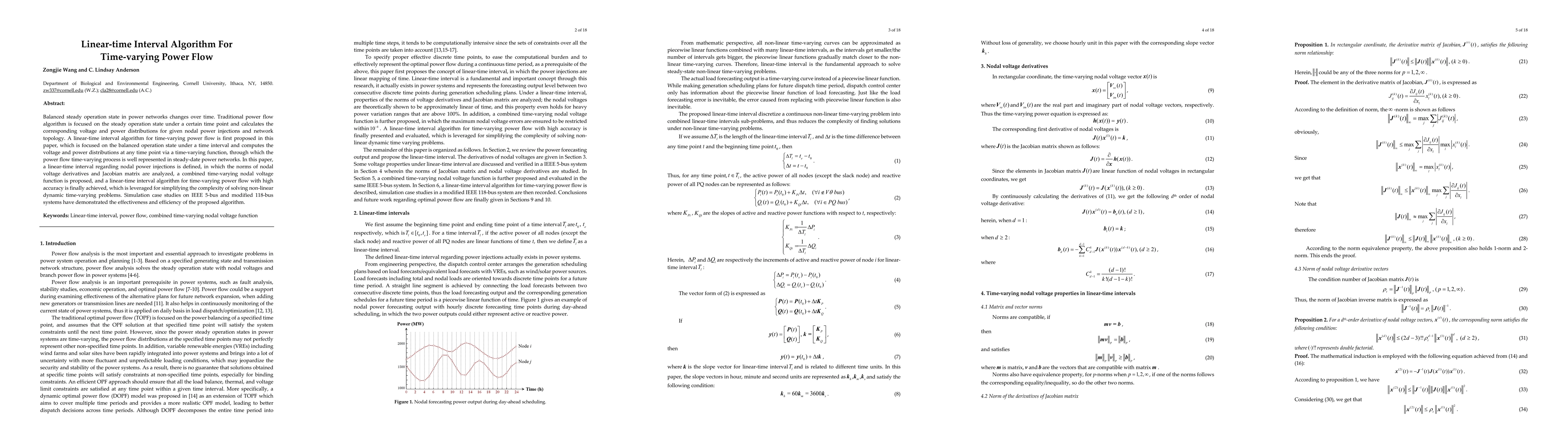 This paper proposes a linear-time interval algorithm for time-varying power flow, aiming to represent the power flow process over a time interval rather than at a single point. The algorithm simplifies solving non-linear dynamic problems and is validated through simulations on IEEE 5-bus and modified 118-bus systems.