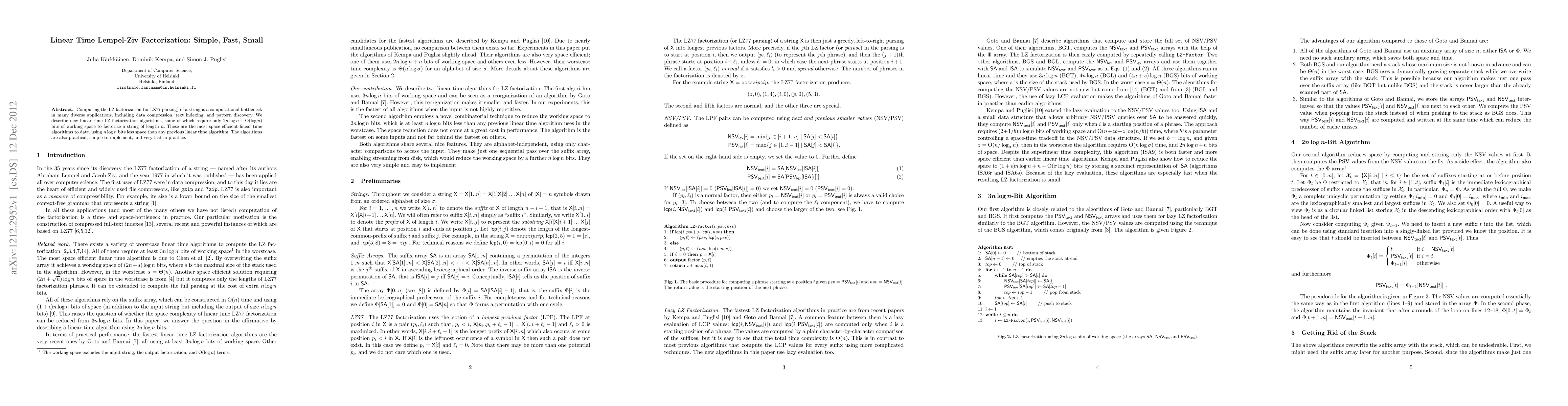 Computing the LZ factorization (or LZ77 parsing) of a string is a computational bottleneck in many diverse applications, including data compression, text indexing, and pattern discovery. We describe new linear time LZ factorization algorithms, some of which require only 2n log n + O(log n) bits of working space to factorize a string of length n. These are the most space efficient linear time algorithms to date, using n log n bits less space than any previous linear time algorithm. The algorithms are also practical, simple to implement, and very fast in practice.