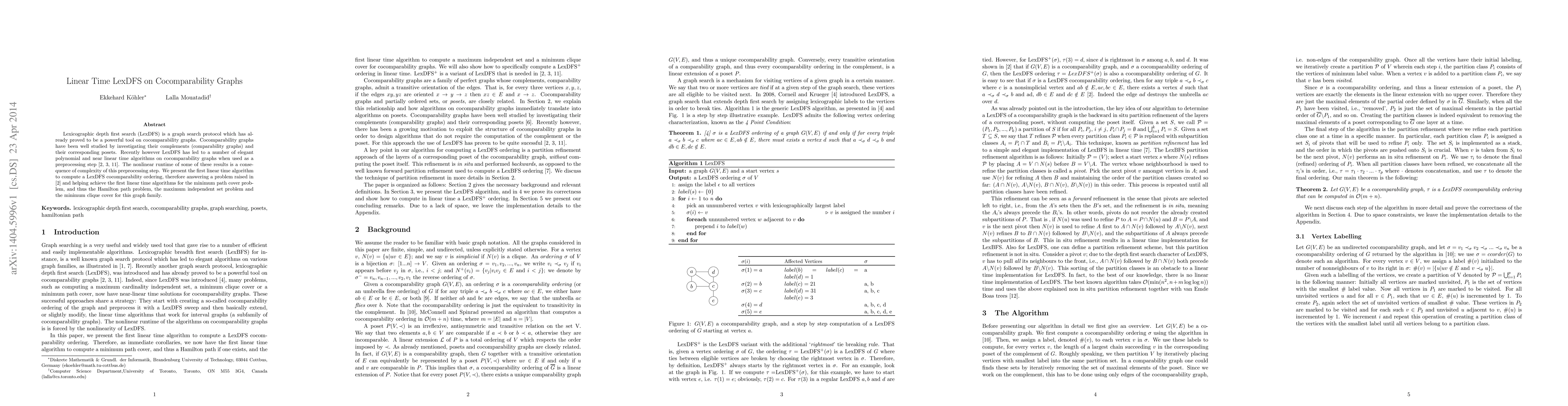 This paper introduces the first linear time algorithm for computing a lexicographic depth-first search (LexDFS) ordering on cocomparability graphs, resolving an open problem and enabling linear time solutions for several graph optimization problems including Hamilton path, maximum independent set, and minimum clique cover.