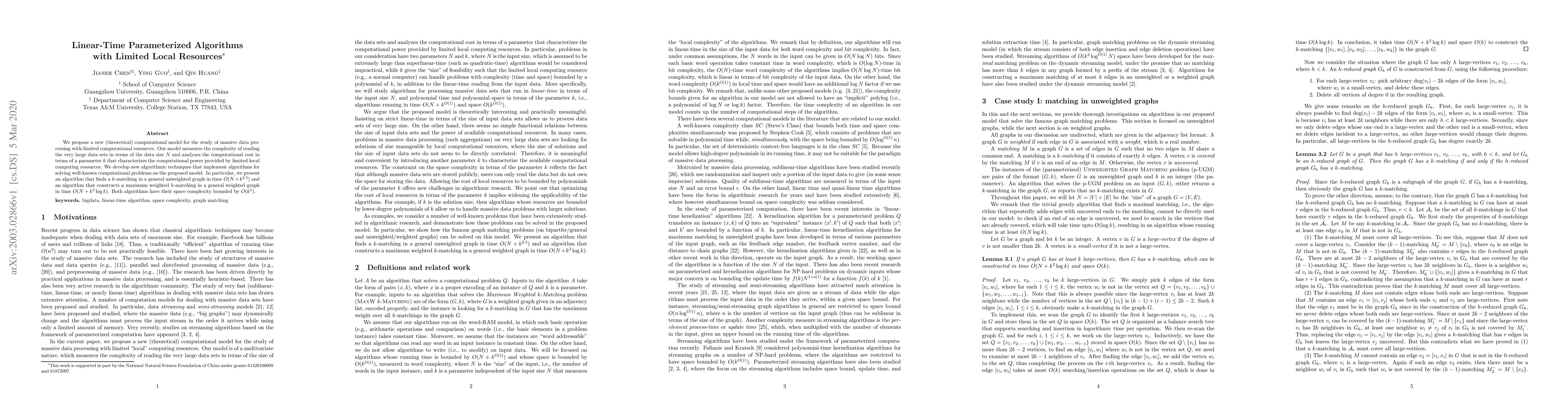 This paper introduces a theoretical computational model for processing large data sets under limited local resources, focusing on complexity in terms of data size N and a parameter k representing available computational power. It presents linear-time algorithms for finding k-matchings in unweighted and weighted graphs with respective complexities of O(N + k^{2.5}) and O(N + k^3 log k), while maintaining space complexity of O(k^2).