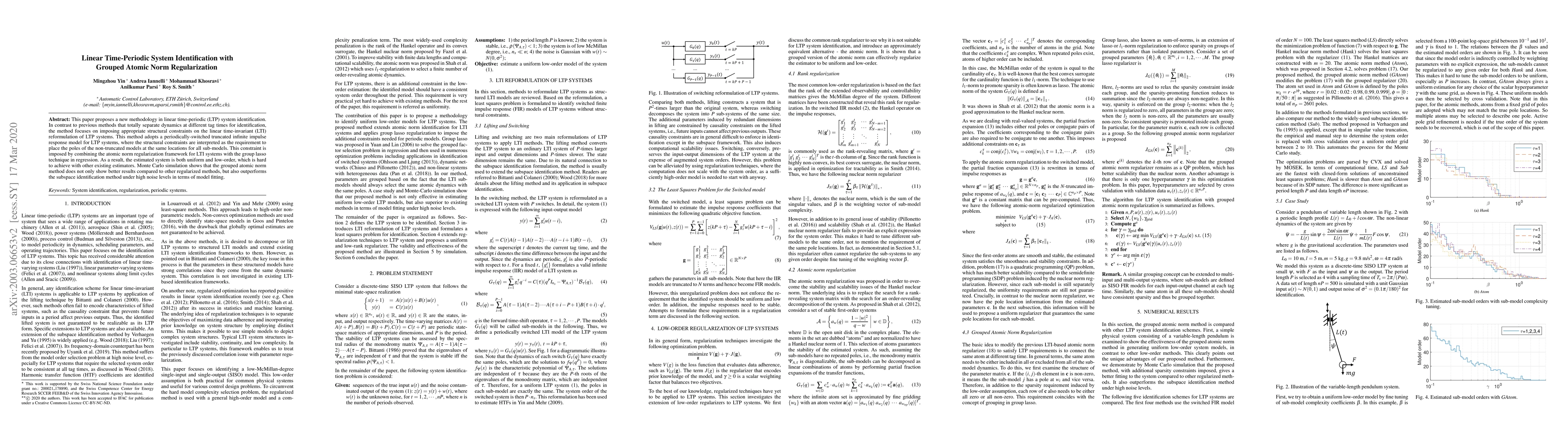 This paper proposes a new methodology in linear time-periodic (LTP) system identification. In contrast to previous methods that totally separate dynamics at different tag times for identification, the method focuses on imposing appropriate structural constraints on the linear time-invariant (LTI) reformulation of LTP systems. This method adopts a periodically-switched truncated infinite impulse response model for LTP systems, where the structural constraints are interpreted as the requirement to place the poles of the non-truncated models at the same locations for all sub-models. This constraint is imposed by combining the atomic norm regularization framework for LTI systems with the group lasso technique in regression. As a result, the estimated system is both uniform and low-order, which is hard to achieve with other existing estimators. Monte Carlo simulation shows that the grouped atomic norm method does not only show better results compared to other regularized methods, but also outperforms the subspace identification method under high noise levels in terms of model fitting.