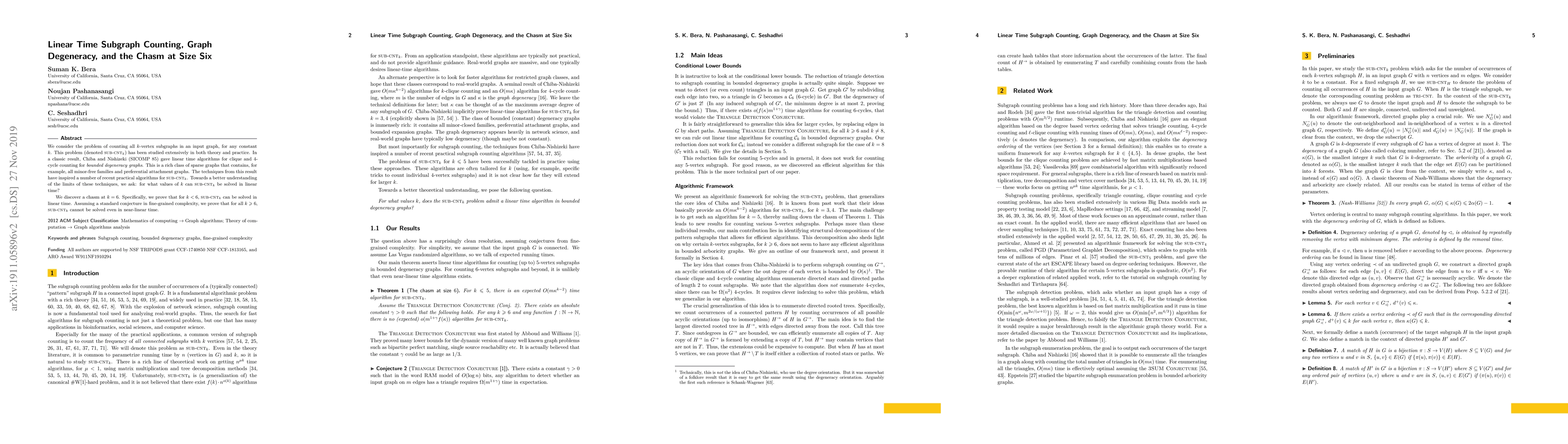 We consider the problem of counting all $k$-vertex subgraphs in an input graph, for any constant $k$. This problem (denoted sub-cnt$_k$) has been studied extensively in both theory and practice. In a classic result, Chiba and Nishizeki (SICOMP 85) gave linear time algorithms for clique and 4-cycle counting for bounded degeneracy graphs. This is a rich class of sparse graphs that contains, for example, all minor-free families and preferential attachment graphs. The techniques from this result have inspired a number of recent practical algorithms for sub-cnt$_k$. Towards a better understanding of the limits of these techniques, we ask: for what values of $k$ can sub-cnt$_k$ be solved in linear time? We discover a chasm at $k=6$. Specifically, we prove that for $k < 6$, sub-cnt$_k$ can be solved in linear time. Assuming a standard conjecture in fine-grained complexity, we prove that for all $k \geq 6$, sub-cnt$_k$ cannot be solved even in near-linear time.
