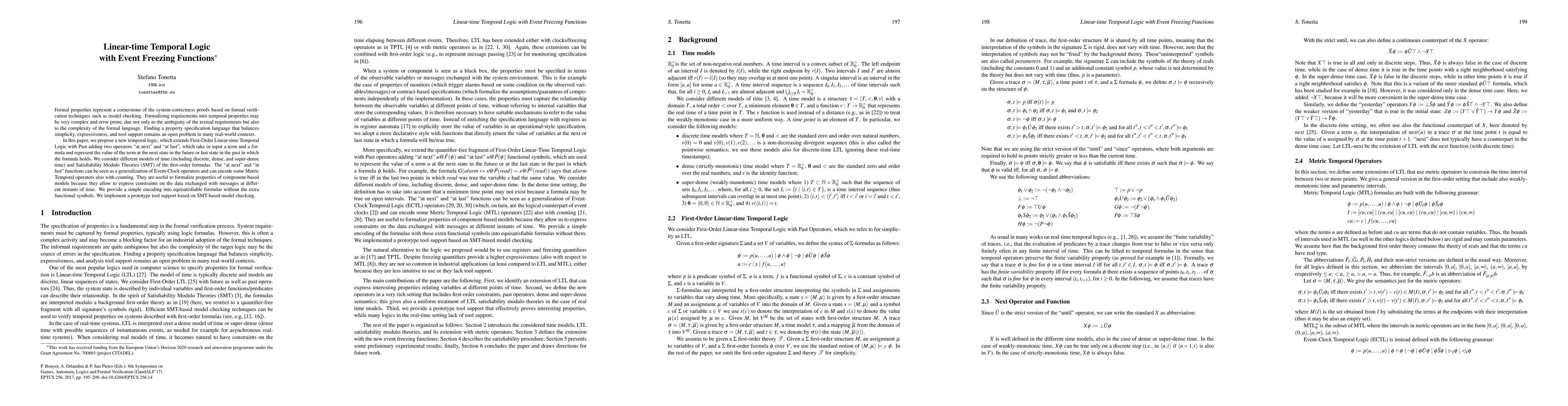Formal properties represent a cornerstone of the system-correctness proofs based on formal verification techniques such as model checking. Formalizing requirements into temporal properties may be very complex and error prone, due not only to the ambiguity of the textual requirements but also to the complexity of the formal language. Finding a property specification language that balances simplicity, expressiveness, and tool support remains an open problem in many real-world contexts. In this paper, we propose a new temporal logic, which extends First-Order Linear-time Temporal Logic with Past adding two operators "at next" and "at last", which take in input a term and a formula and represent the value of the term at the next state in the future or last state in the past in which the formula holds. We consider different models of time (including discrete, dense, and super-dense time) and Satisfiability Modulo Theories (SMT) of the first-order formulas. The "at next" and "at last" functions can be seen as a generalization of Event-Clock operators and can encode some Metric Temporal operators also with counting. They are useful to formalize properties of component-based models because they allow to express constraints on the data exchanged with messages at different instants of time. We provide a simple encoding into equisatisfiable formulas without the extra functional symbols. We implement a prototype tool support based on SMT-based model checking.