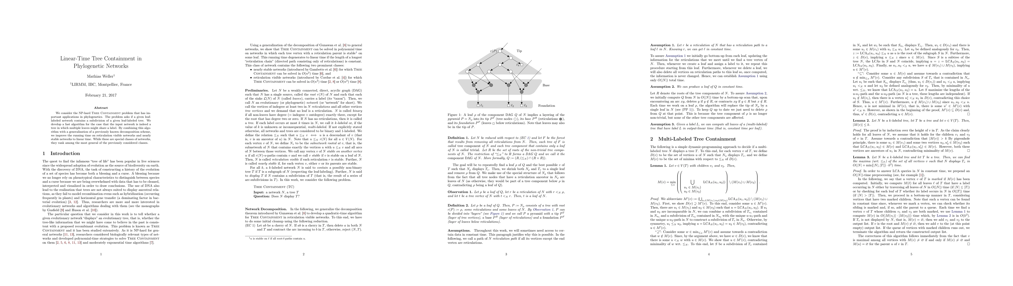 This paper presents a linear-time algorithm for solving the NP-hard Tree Containment problem in phylogenetic networks, specifically for networks that are trees with multiple leaves sharing labels. The authors enhance the efficiency by extending a decomposition scheme to handle reticulation visible and nearly stable networks.