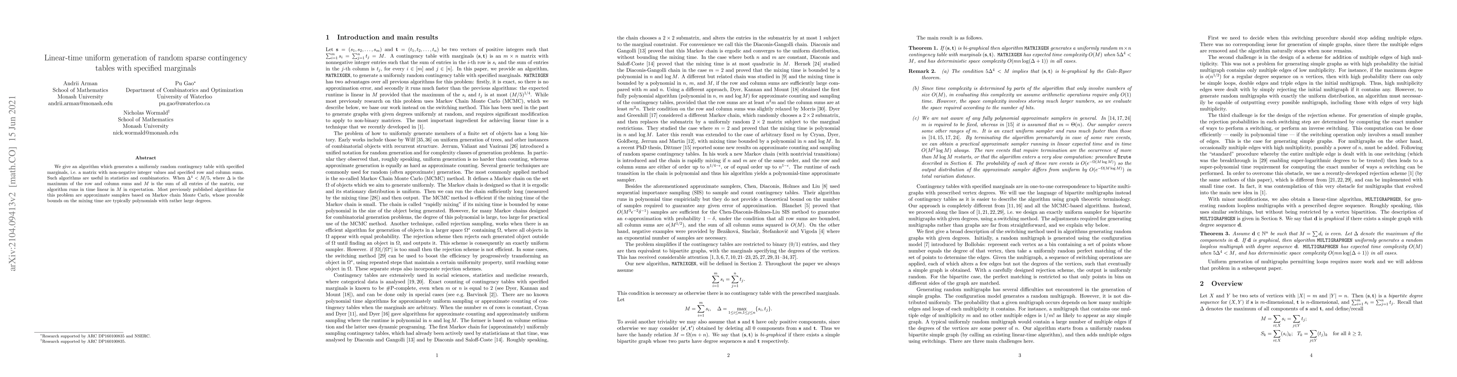 This paper presents a linear-time algorithm for generating uniformly random sparse contingency tables with specified marginals, outperforming previous polynomial-time Markov chain Monte Carlo methods. The algorithm operates in linear time in expectation when the maximum of row and column sums is small relative to the total number of entries.