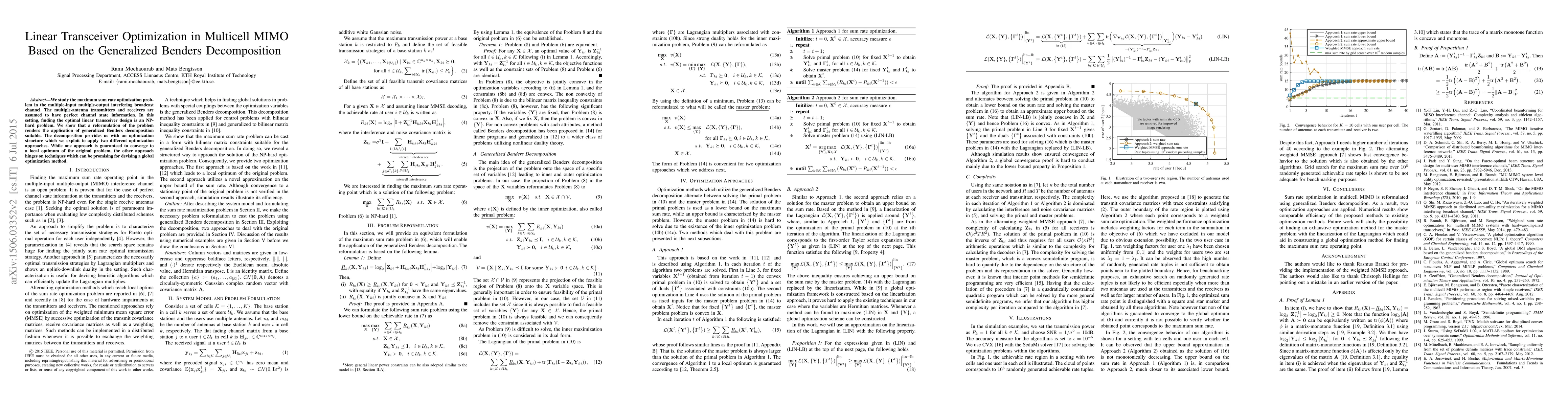This paper optimizes linear transceiver design for multicell MIMO systems using generalized Benders decomposition to tackle the NP-hard problem of maximum sum rate in an interfering broadcast channel. It presents two optimization approaches, one for local optima and another potentially for global optimization.