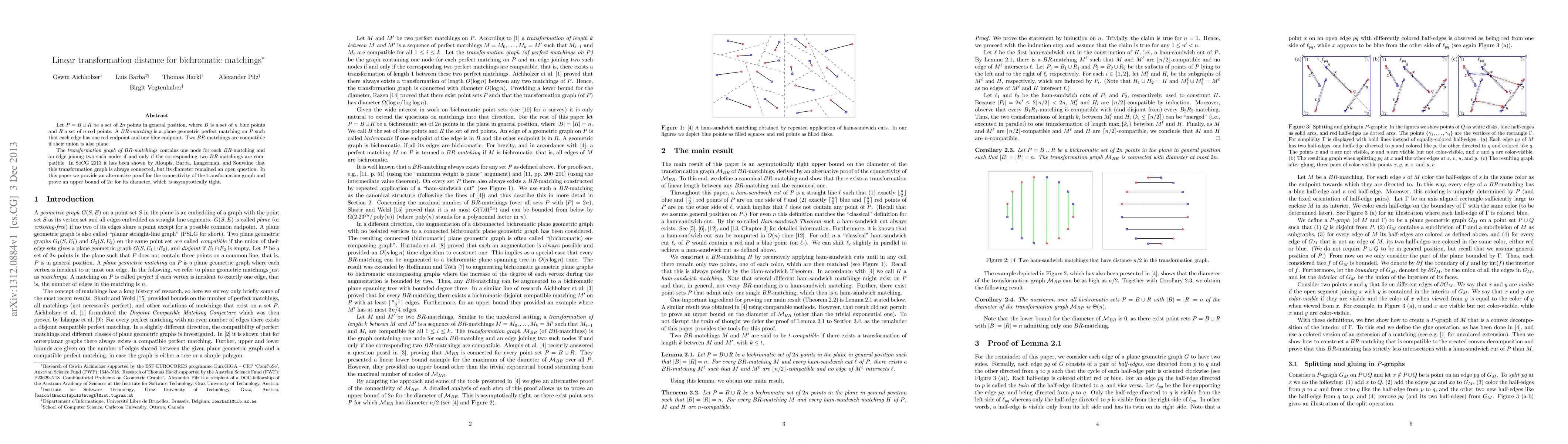 Let $P=B\cup R$ be a set of $2n$ points in general position, where $B$ is a set of $n$ blue points and $R$ a set of $n$ red points. A \emph{$BR$-matching} is a plane geometric perfect matching on $P$ such that each edge has one red endpoint and one blue endpoint. Two $BR$-matchings are compatible if their union is also plane. The \emph{transformation graph of $BR$-matchings} contains one node for each $BR$-matching and an edge joining two such nodes if and only if the corresponding two $BR$-matchings are compatible. In SoCG 2013 it has been shown by Aloupis, Barba, Langerman, and Souvaine that this transformation graph is always connected, but its diameter remained an open question. In this paper we provide an alternative proof for the connectivity of the transformation graph and prove an upper bound of $2n$ for its diameter, which is asymptotically tight.