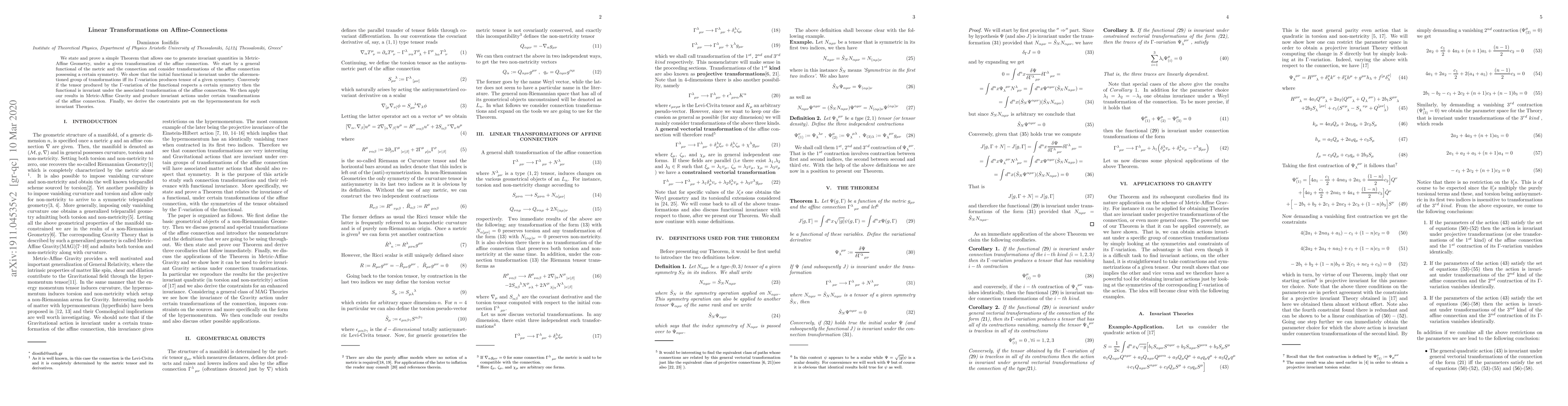 The paper introduces a theorem that allows for invariant quantities to be generated in Metric-Affine Geometry under specific transformations of the affine connection, enabling invariant actions in theories like Metric-Affine Gravity.