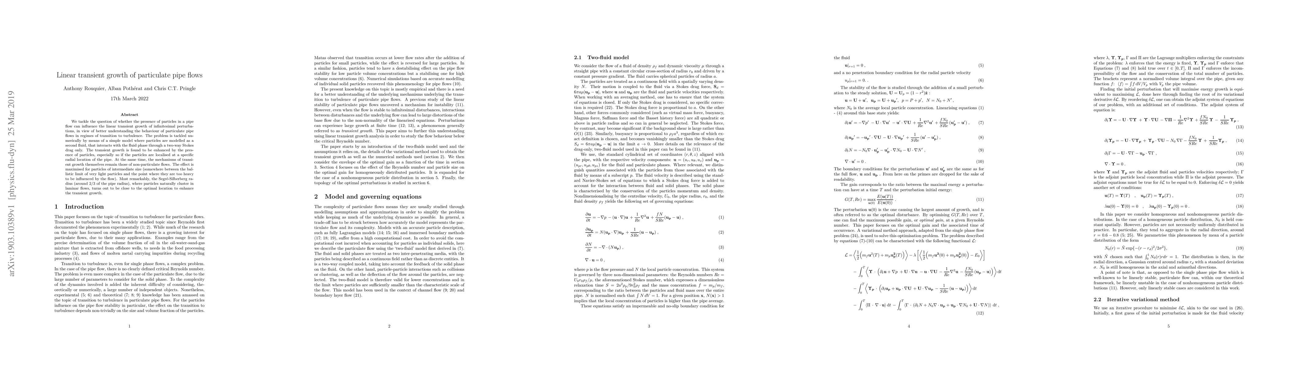 This study investigates how particles in pipe flow affect the linear transient growth of infinitesimal perturbations, finding that particles enhance this growth, especially when localized at the Segre-Silberberg radius. The mechanisms of transient growth remain similar to those in non-particulate flows, with the most significant effect observed for particles of intermediate size.