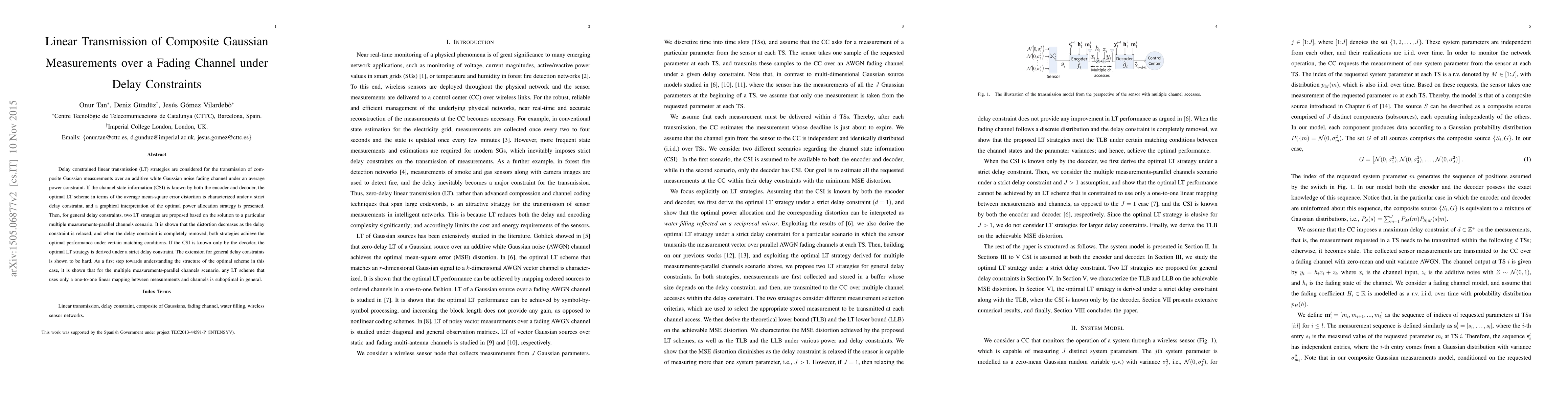 This paper investigates delay-constrained linear transmission strategies for composite Gaussian measurements over a fading channel, characterizing optimal schemes under strict and general delay constraints. It shows that performance improves as delay constraints relax, and highlights the suboptimality of one-to-one linear mappings when channel state information is only available at the decoder.