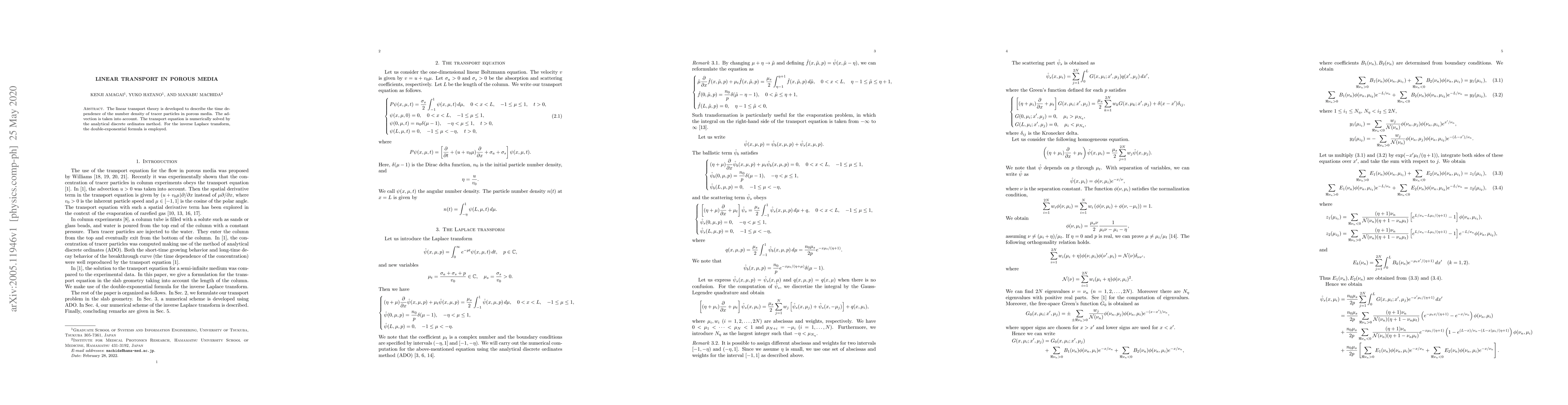 This paper develops a linear transport theory for tracer particles in porous media, incorporating advection, and uses the analytical discrete ordinates method and double-exponential formula for numerical solutions and inverse Laplace transforms.