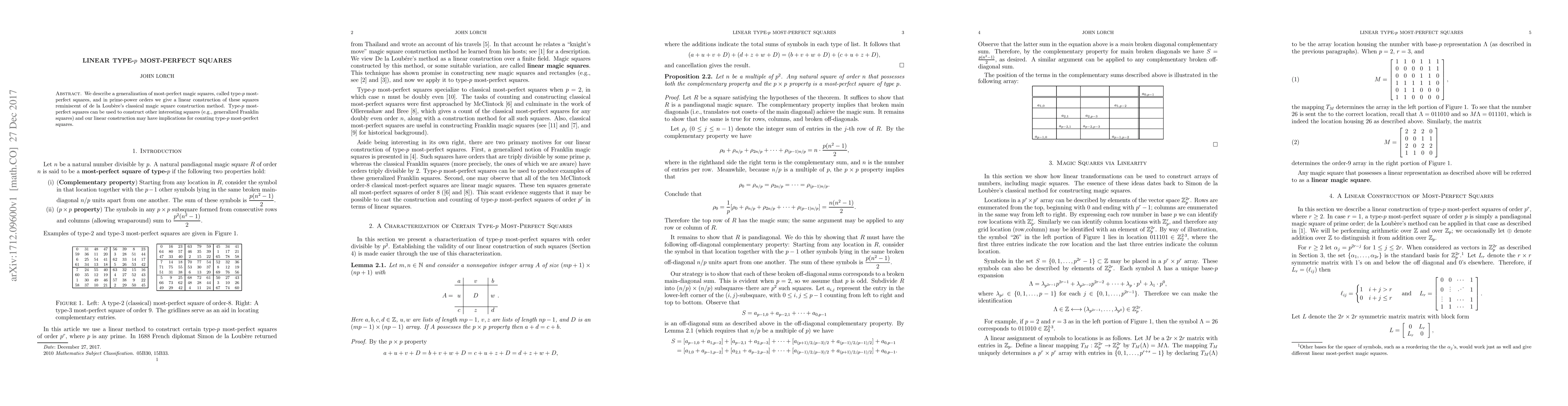 We describe a generalization of most-perfect magic squares, called type-p most-perfect squares, and in prime-power orders we give a linear construction of these squares reminiscent of de la Loubere's classical magic square construction method. Type-p most-perfect squares can be used to construct other interesting squares (e.g., generalized Franklin squares) and our linear construction may have implications for counting type-p most-perfect squares.