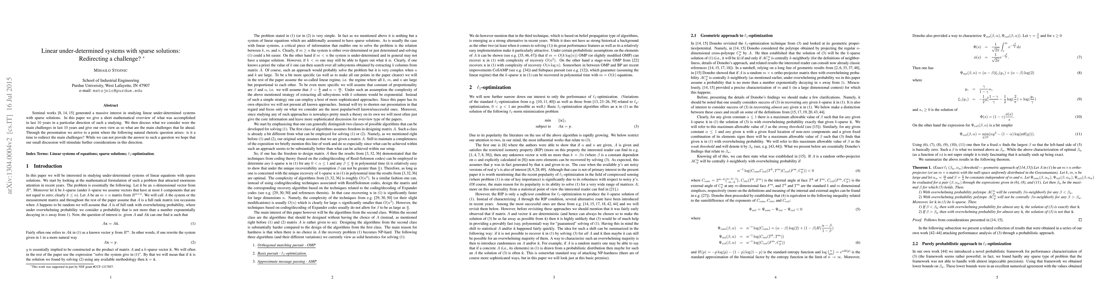 Seminal works \cite{CRT,DonohoUnsigned,DonohoPol} generated a massive interest in studying linear under-determined systems with sparse solutions. In this paper we give a short mathematical overview of what was accomplished in last 10 years in a particular direction of such a studying. We then discuss what we consider were the main challenges in last 10 years and give our own view as to what are the main challenges that lie ahead. Through the presentation we arrive to a point where the following natural rhetoric question arises: is it a time to redirect the main challenges? While we can not provide the answer to such a question we hope that our small discussion will stimulate further considerations in this direction.