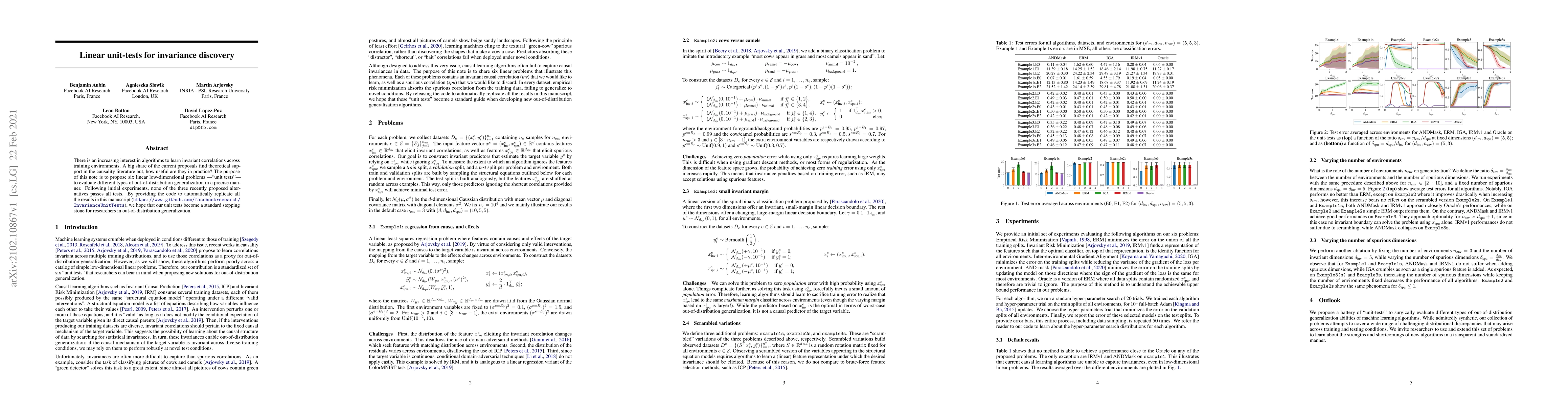 There is an increasing interest in algorithms to learn invariant correlations across training environments. A big share of the current proposals find theoretical support in the causality literature but, how useful are they in practice? The purpose of this note is to propose six linear low-dimensional problems -- unit tests -- to evaluate different types of out-of-distribution generalization in a precise manner. Following initial experiments, none of the three recently proposed alternatives passes all tests. By providing the code to automatically replicate all the results in this manuscript (https://www.github.com/facebookresearch/InvarianceUnitTests), we hope that our unit tests become a standard steppingstone for researchers in out-of-distribution generalization.