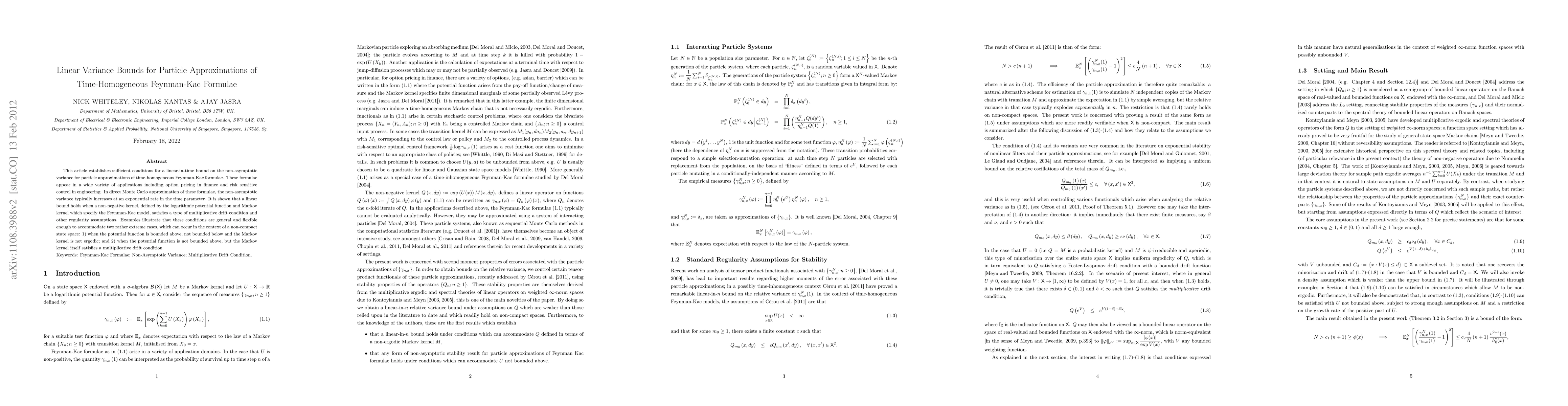 This paper establishes conditions for linear variance bounds in particle approximations of time-homogeneous Feynman-Kac formulae, showing that a linear bound holds when the kernel satisfies a multiplicative drift condition and other assumptions. The conditions are shown to be flexible enough to cover extreme cases in non-compact state spaces.