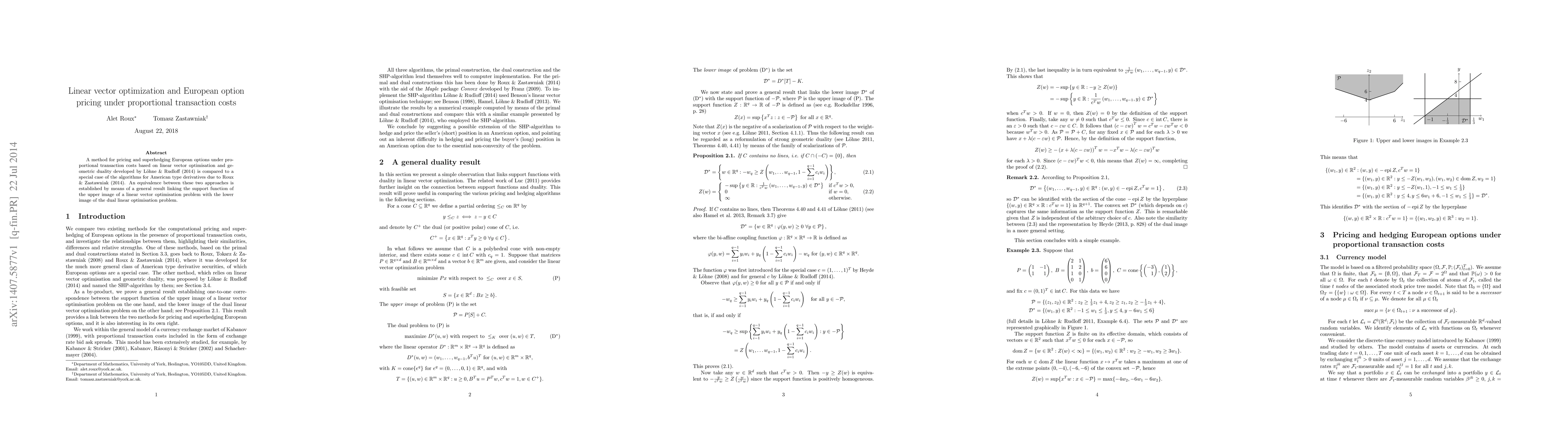 A method for pricing and superhedging European options under proportional transaction costs based on linear vector optimisation and geometric duality developed by Lohne & Rudloff (2014) is compared to a special case of the algorithms for American type derivatives due to Roux & Zastawniak (2014). An equivalence between these two approaches is established by means of a general result linking the support function of the upper image of a linear vector optimisation problem with the lower image of the dual linear optimisation problem.