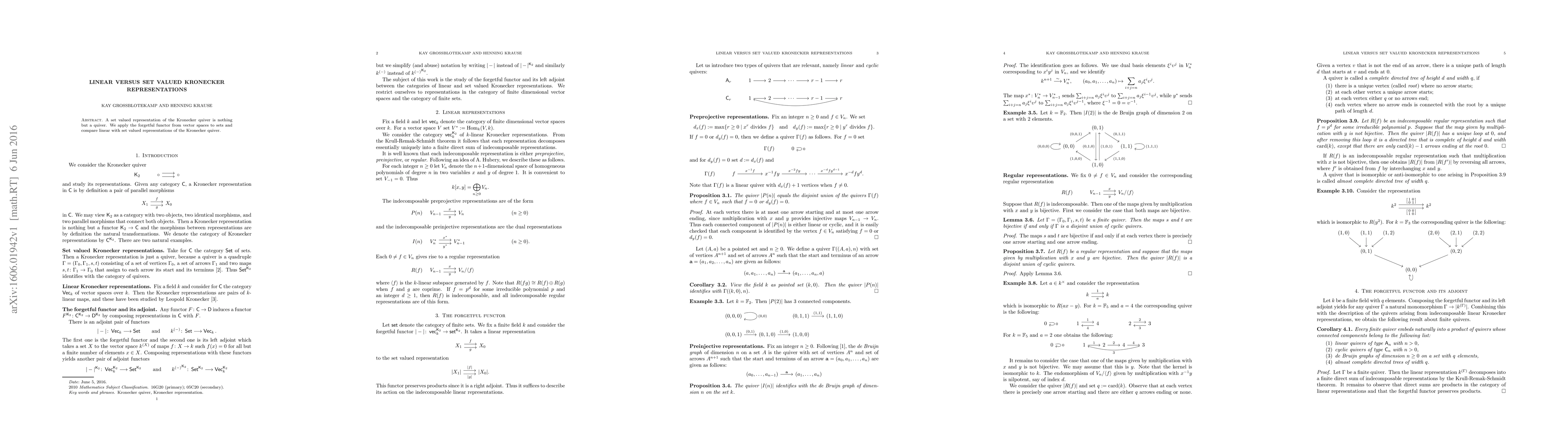 Summary: This paper examines the difference between linear and set-valued representations of the Kronecker quiver, showing that set-valued representations can be viewed as quivers through a forgetful functor from vector spaces to sets. It highlights the implications and comparisons of these two approaches.