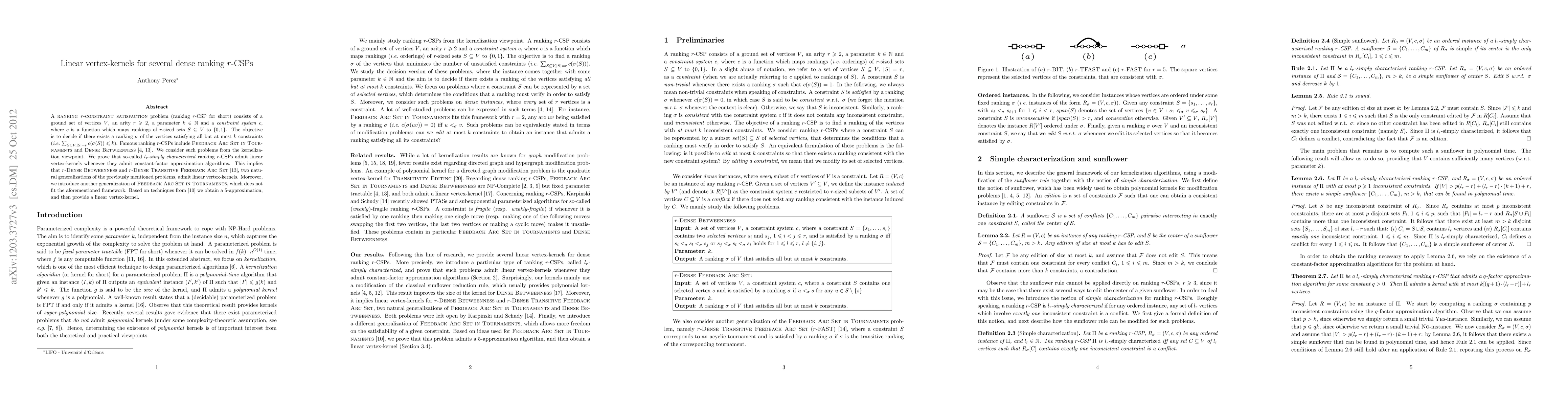 This paper investigates linear vertex-kernels for several dense ranking r-CSPs, proving that certain problems admit linear vertex-kernels when they have constant-factor approximation algorithms. It also provides a 5-approximation and a linear vertex-kernel for a new generalization of the Feedback Arc Set in Tournaments.