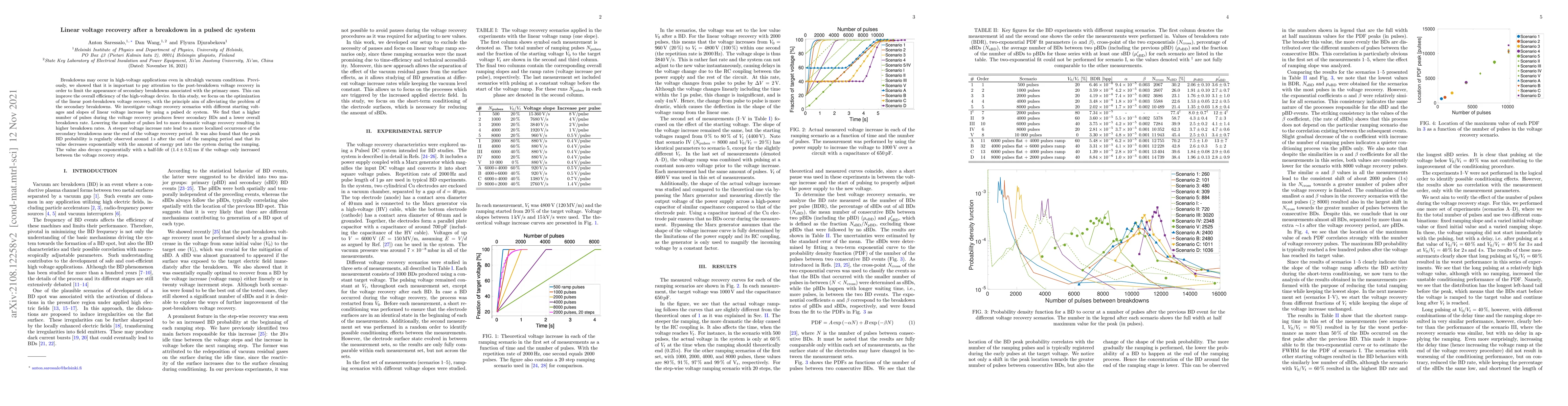 This study investigates the linear voltage recovery after breakdowns in a pulsed dc system to minimize secondary breakdowns, finding that more pulses during recovery reduce breakdown rates, while a steeper voltage increase causes localized secondary breakdowns near recovery's end. The peak breakdown probability decreases exponentially with energy input and has a half-life of (1.4±0.3) ms.
