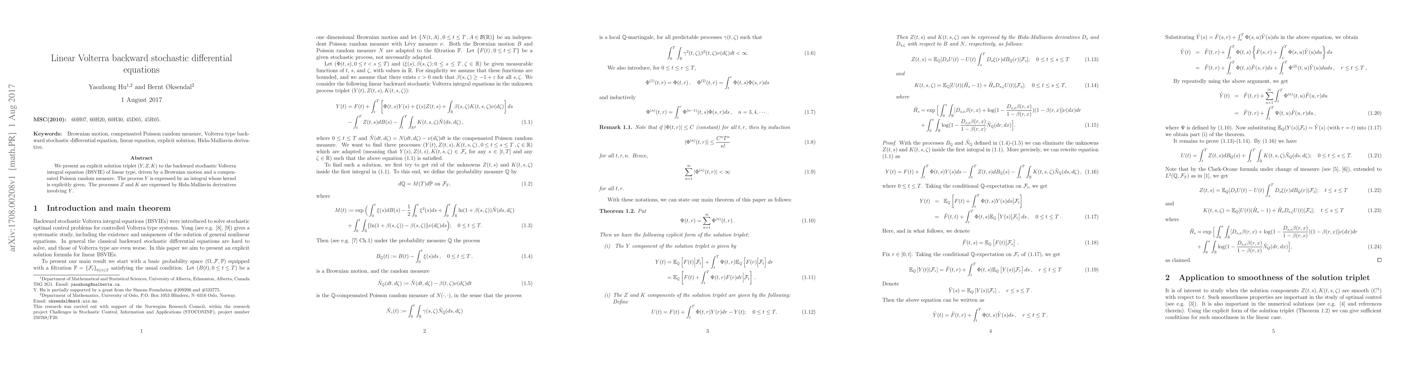 We present an explicit solution triplet $(Y, Z, K)$ to the backward stochastic Volterra integral equation (BSVIE) of linear type, driven by a Brownian motion and a compensated Poisson random measure. The process $Y$ is expressed by an integral whose kernel is explicitly given. The processes $Z$ and $K$ are expressed by Hida-Malliavin derivatives involving $Y$.