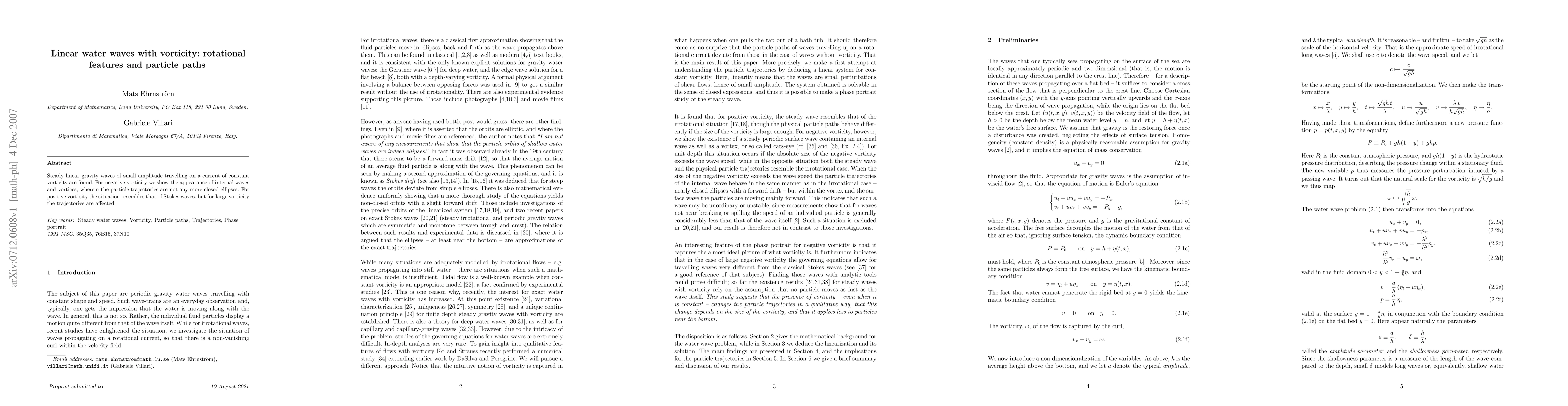 Summary: This study investigates linear water waves on a current with constant vorticity, revealing that negative vorticity induces internal waves and vortices, altering particle trajectories from closed ellipses. Positive vorticity initially mimics Stokes waves, but significant vorticity distorts these trajectories.
