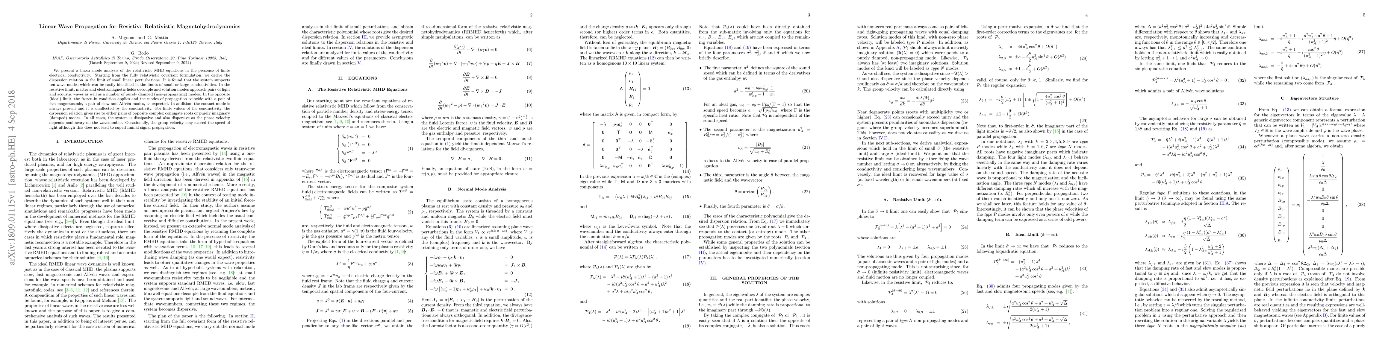 This paper conducts a linear mode analysis of relativistic magnetohydrodynamics (MHD) with finite conductivity, identifying ten wave modes. In resistive limits, modes resemble light and acoustic waves, while in ideal limits, the modes align with fast magnetosonic, slow, Alfv\'en, and the unaffected contact mode.