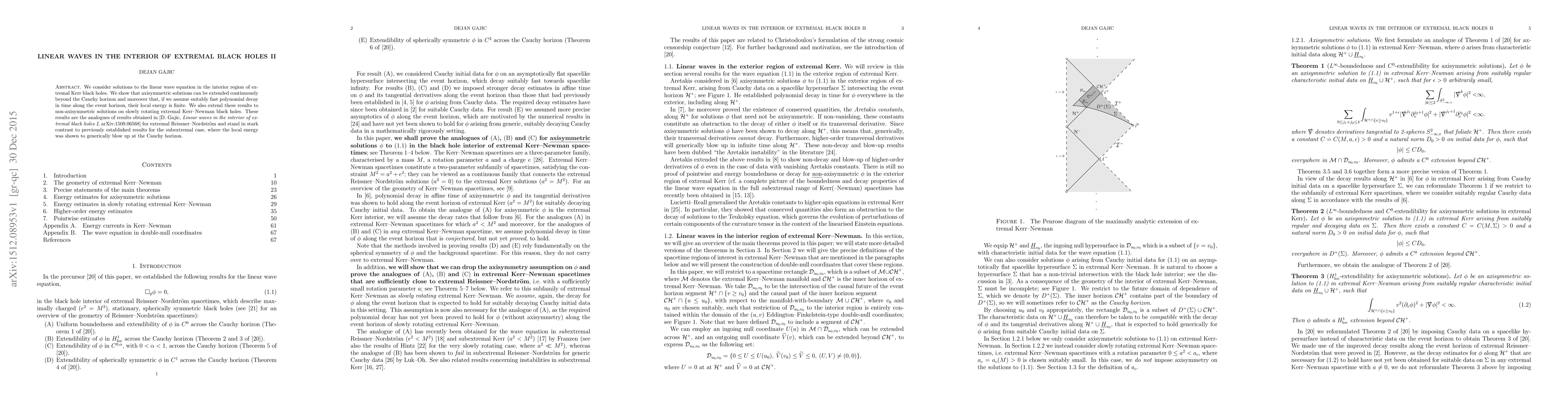 This paper investigates linear wave solutions in the interior of extremal Kerr black holes, demonstrating that axisymmetric waves extend beyond the Cauchy horizon with finite local energy under certain decay conditions. The findings extend to non-axisymmetric waves in slowly rotating extremal Kerr-Newman black holes, contrasting with results for subextremal cases where local energy typically diverges.