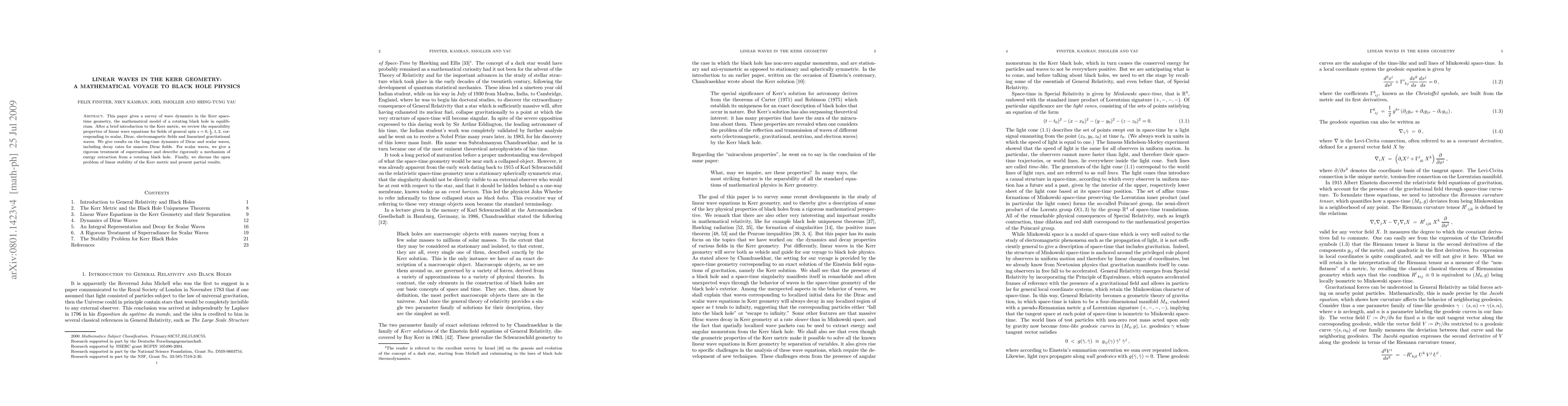This paper gives a survey of wave dynamics in the Kerr space-time geometry, the mathematical model of a rotating black hole in equilibrium. After a brief introduction to the Kerr metric, we review the separability properties of linear wave equations for fields of general spin $s=0, 1/2, 1, 2$, corresponding to scalar, Dirac, electromagnetic fields and linearized gravitational waves. We give results on the long-time dynamics of Dirac and scalar waves, including decay rates for massive Dirac fields. For scalar waves, we give a rigorous treatment of superradiance and describe rigorously a mechanism of energy extraction from a rotating black hole. Finally, we discuss the open problem of linear stability of the Kerr metric and present partial results.